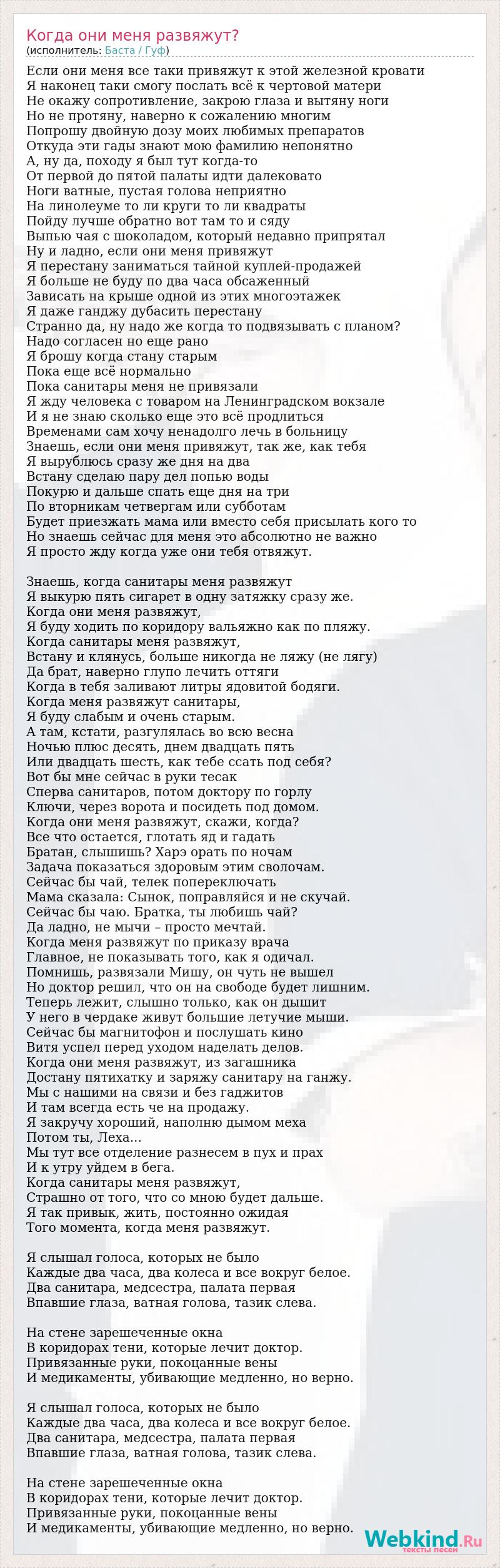 Если они меня все таки привяжут к этой железной кровати Я наконец таки смогу послать всё к чертовой матери Не окажу сопротивление, закрою глаза и вытяну ноги Но не протяну, наверно к сожалению многим Попрошу двойную дозу моих любимых препаратов Откуда эти гады знают мою фамилию непонятно А, ну да, походу я был тут когда-то От первой до пятой палаты идти далековато Ноги ватные, пустая голова неприятно На линолеуме то ли круги то ли квадраты Пойду лучше обратно вот там то и сяду Выпью чая с шоколадом, который недавно припрятал Ну и ладно, если они меня привяжут Я перестану заниматься тайной куплей-продажей Я больше не буду по два часа обсаженный Зависать на крыше одной из этих многоэтажек Я даже ганджу дубасить перестану Странно да, ну надо же когда то подвязывать с планом? Надо согласен но еще рано Я брошу когда стану старым Пока еще всё нормально Пока санитары меня не привязали Я жду человека с товаром на Ленинградском вокзале И я не знаю сколько еще это всё продлиться Временами сам хочу ненадолго лечь в больницу Знаешь, если они меня привяжут, так же, как тебя Я вырублюсь сразу же дня на два Встану сделаю пару дел попью воды Покурю и дальше спать еще дня на три По вторникам четвергам или субботам Будет приезжать мама или вместо себя присылать кого то Но знаешь сейчас для меня это абсолютно не важно Я просто жду когда уже они тебя отвяжут. Знаешь, когда санитары меня развяжут Я выкурю пять сигарет в одну затяжку сразу же. Когда они меня развяжут, Я буду ходить по коридору вальяжно как по пляжу. Когда санитары меня развяжут, Встану и клянусь, больше никогда не ляжу (не лягу) Да брат, наверно глупо лечить оттяги Когда в тебя заливают литры ядовитой бодяги. Когда меня развяжут санитары, Я буду слабым и очень старым. А там, кстати, разгулялась во всю весна Ночью плюс десять, днем двадцать пять Или двадцать шесть, как тебе ссать под себя? Вот бы мне сейчас в руки тесак Сперва санитаров, потом доктору по горлу Ключи, через ворота и посидеть под домом. Когда они меня развяжут, скажи, когда? Все что остается, глотать яд и гадать Братан, слышишь? Харэ орать по ночам Задача показаться здоровым этим сволочам. Сейчас бы чай, телек попереключать Мама сказала: Сынок, поправляйся и не скучай. Сейчас бы чаю. Братка, ты любишь чай? Да ладно, не мычи – просто мечтай. Когда меня развяжут по приказу врача Главное, не показывать того, как я одичал. Помнишь, развязали Мишу, он чуть не вышел Но доктор решил, что он на свободе будет лишним. Теперь лежит, слышно только, как он дышит У него в чердаке живут большие летучие мыши. Сейчас бы магнитофон и послушать кино Витя успел перед уходом наделать делов. Когда они меня развяжут, из загашника Достану пятихатку и заряжу санитару на ганжу. Мы с нашими на связи и без гаджитов И там всегда есть че на продажу. Я закручу хороший, наполню дымом меха Потом ты, Леха... Мы тут все отделение разнесем в пух и прах И к утру уйдем в бега. Когда санитары меня развяжут, Страшно от того, что со мною будет дальше. Я так привык, жить, постоянно ожидая Того момента, когда меня развяжут. Я слышал голоса, которых не было Каждые два часа, два колеса и все вокруг белое. Два санитара, медсестра, палата первая Впавшие глаза, ватная голова, тазик слева. На стене зарешеченные окна В коридорах тени, которые лечит доктор. Привязанные руки, покоцанные вены И медикаменты, у