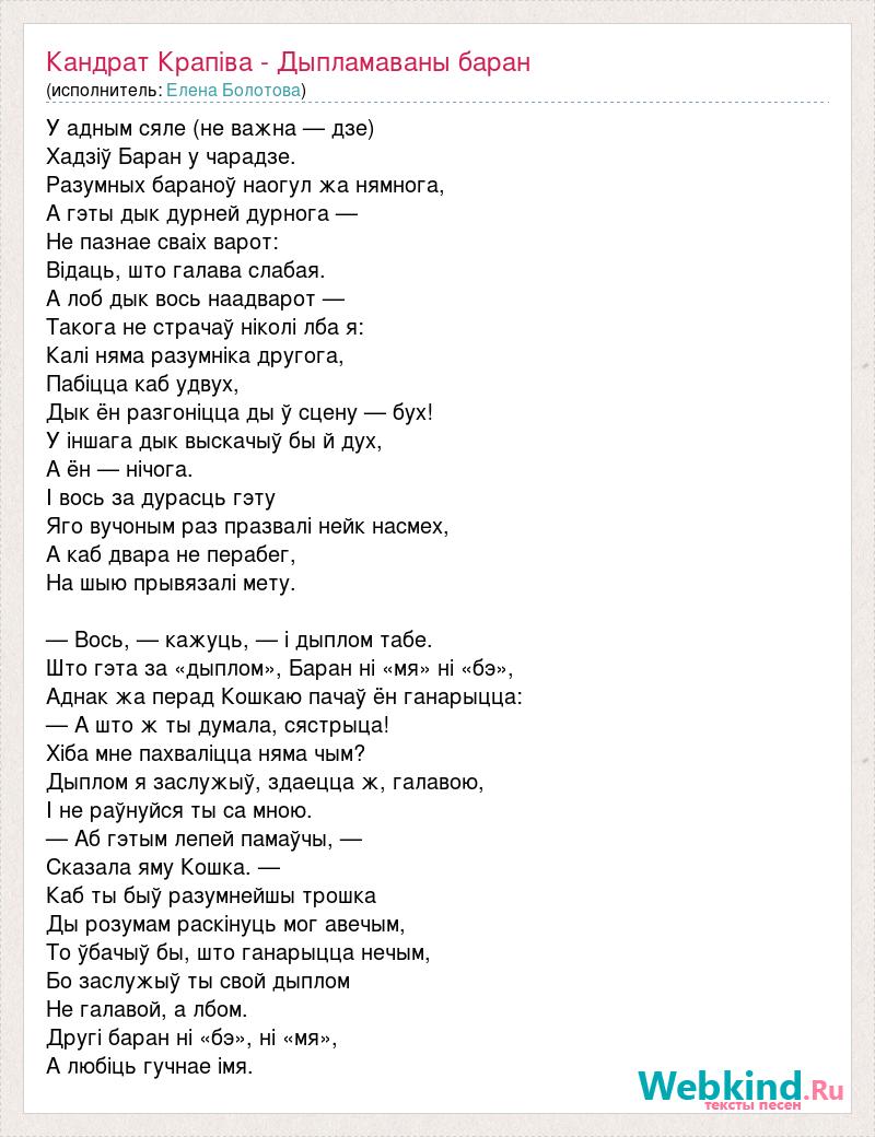 У адным сяле (не важна — дзе) Хадзіў Баран у чарадзе. Разумных бараноў наогул жа нямнога, А гэты дык дурней дурнога — Не пазнае сваіх варот: Відаць, што галава слабая. А лоб дык вось наадварот — Такога не страчаў ніколі лба я: Калі няма разумніка другога, Пабіцца каб удвух, Дык ён разгоніцца ды ў сцену — бух! У іншага дык выскачыў бы й дух, А ён — нічога. I вось за дурасць гэту Яго вучоным раз празвалі нейк насмех, А каб двара не перабег, На шыю прывязалі мету. — Вось, — кажуць, — і дыплом табе. Што гэта за «дыплом», Баран ні «мя» ні «бэ», Аднак жа перад Кошкаю пачаў ён ганарыцца: — А што ж ты думала, сястрыца! Хіба мне пахваліцца няма чым? Дыплом я заслужыў, здаецца ж, галавою, I не раўнуйся ты са мною. — Аб гэтым лепей памаўчы, — Сказала яму Кошка. — Каб ты быў разумнейшы трошка Ды розумам раскінуць мог авечым, То ўбачыў бы, што ганарыцца нечым, Бо заслужыў ты свой дыплом Не галавой, а лбом. Другі баран ні «бэ», ні «мя», А любіць гучнае імя.