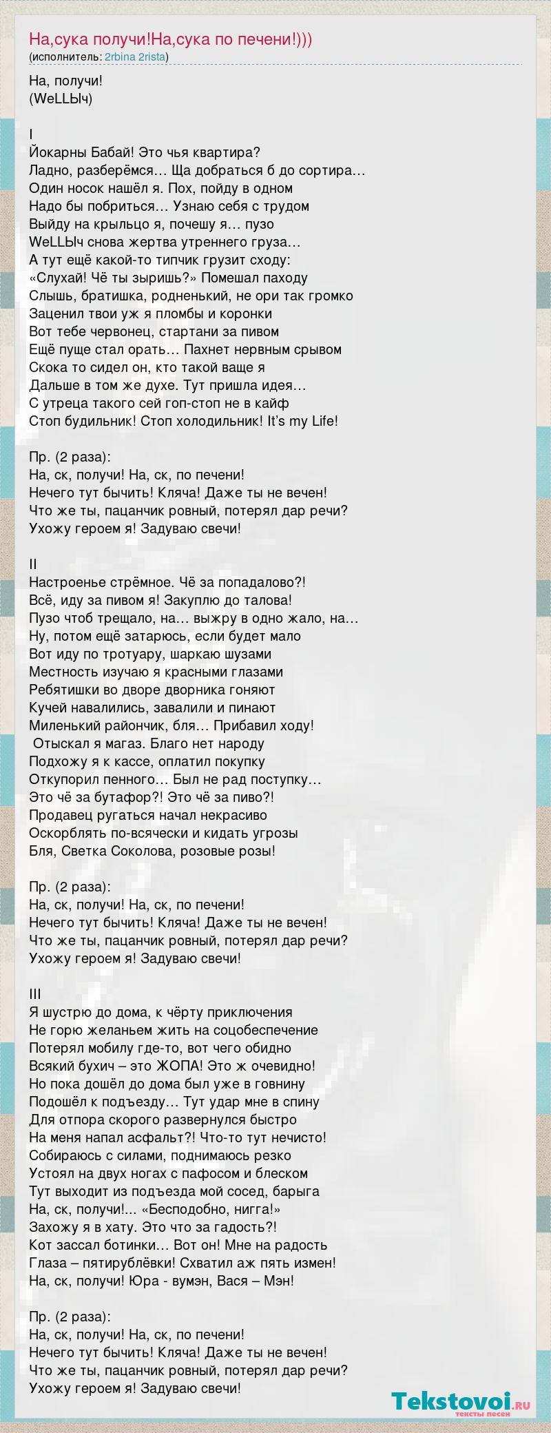 На, получи! (WeLLЫч) I Йокарны Бабай! Это чья квартира? Ладно, разберёмся… Ща добраться б до сортира… Один носок нашёл я. Пох, пойду в одном Надо бы побриться… Узнаю себя с трудом Выйду на крыльцо я, почешу я… пузо WeLLЫч снова жертва утреннего груза… А тут ещё какой-то типчик грузит сходу: «Слухай! Чё ты зыришь?» Помешал паходу Слышь, братишка, родненький, не ори так громко Заценил твои уж я пломбы и коронки Вот тебе червонец, стартани за пивом Ещё пуще стал орать… Пахнет нервным срывом Скока то сидел он, кто такой ваще я Дальше в том же духе. Тут пришла идея… С утреца такого сей гоп-стоп не в кайф Стоп будильник! Стоп холодильник! It’s my Life! Пр. (2 раза): На, ск, получи! На, ск, по печени! Нечего тут бычить! Кляча! Даже ты не вечен! Что же ты, пацанчик ровный, потерял дар речи? Ухожу героем я! Задуваю свечи! II Настроенье стрёмное. Чё за попадалово?! Всё, иду за пивом я! Закуплю до талова! Пузо чтоб трещало, на… выжру в одно жало, на… Ну, потом ещё затарюсь, если будет мало Вот иду по тротуару, шаркаю шузами Местность изучаю я красными глазами Ребятишки во дворе дворника гоняют Кучей навалились, завалили и пинают Миленький райончик, бля… Прибавил ходу! Отыскал я магаз. Благо нет народу Подхожу я к кассе, оплатил покупку Откупорил пенного… Был не рад поступку… Это чё за бутафор?! Это чё за пиво?! Продавец ругаться начал некрасиво Оскорблять по-всячески и кидать угрозы Бля, Светка Соколова, розовые розы! Пр. (2 раза): На, ск, получи! На, ск, по печени! Нечего тут бычить! Кляча! Даже ты не вечен! Что же ты, пацанчик ровный, потерял дар речи? Ухожу героем я! Задуваю свечи! III Я шустрю до дома, к чёрту приключения Не горю желаньем жить на соцобеспечение Потерял мобилу где-то, вот чего обидно Всякий бухич – это ЖОПА! Это ж очевидно! Но пока дошёл до дома был уже в говнину Подошёл к подъезду… Тут удар мне в спину Для отпора скорого развернулся быстро На меня напал асфальт?! Что-то тут нечисто! Собираюсь с силами, поднимаюсь резко Устоял на двух ногах с пафосом и блеском Тут выходит из подъезда мой сосед, барыга На, ск, получи!... «Бесподобно, нигга!» Захожу я в хату. Это что за гадость?! Кот зассал ботинки… Вот он! Мне на радость Глаза – пятирублёвки! Схватил аж пять измен! На, ск, получи! Юра - вумэн, Вася – Мэн! Пр. (2 раза): На, ск, получи! На, ск, по печени! Нечего тут бычить! Кляча! Даже ты не вечен! Что же ты, пацанчик ровный, потерял дар речи? Ухожу героем я! Задуваю свечи!