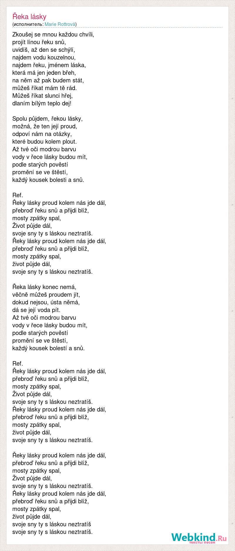 Zkoušej se mnou každou chvíli, projít línou řeku snů, uvidíš, až den se schýlí, najdem vodu kouzelnou, najdem řeku, jménem láska, která má jen jeden břeh, na něm až pak budem stát, můžeš říkat mám tě rád. Můžeš říkat slunci hřej, dlaním bílým teplo dej! Spolu půjdem, řekou lásky, možná, že ten její proud, odpoví nám na otázky, které budou kolem plout. Až tvé oči modrou barvu vody v řece lásky budou mít, podle starých pověstí promění se ve štěstí, každý kousek bolesti a snů. Ref. Řeky lásky proud kolem nás jde dál, přebroď řeku snů a přijdi blíž, mosty zpátky spal, Život půjde dál, svoje sny ty s láskou neztratíš. Řeky lásky proud kolem nás jde dál, přebroď řeku snů a přijdi blíž, mosty zpátky spal, život půjde dál, svoje sny ty s láskou neztratíš. Řeka lásky konec nemá, věčně můžeš proudem jít, dokud nejsou, ústa němá, dá se její voda pít. Až tvé oči modrou barvu vody v řece lásky budou mít, podle starých pověstí promění se ve štěstí, každý kousek bolestí a snů. Ref. Řeky lásky proud kolem nás jde dál, přebroď řeku snů a přijdi blíž, mosty zpátky spal, Život půjde dál, svoje sny ty s láskou neztratíš. Řeky lásky proud kolem nás jde dál, přebroď řeku snů a přijdi blíž, mosty zpátky spal, život půjde dál, svoje sny ty s láskou neztratíš. Řeky lásky proud kolem nás jde dál, přebroď řeku snů a přijdi blíž, mosty zpátky spal, Život půjde dál, svoje sny ty s láskou neztratíš. Řeky lásky proud kolem nás jde dál, přebroď řeku snů a přijdi blíž, mosty zpátky spal, život půjde dál, svoje sny ty s láskou neztratíš svoje sny ty s láskou neztratíš.