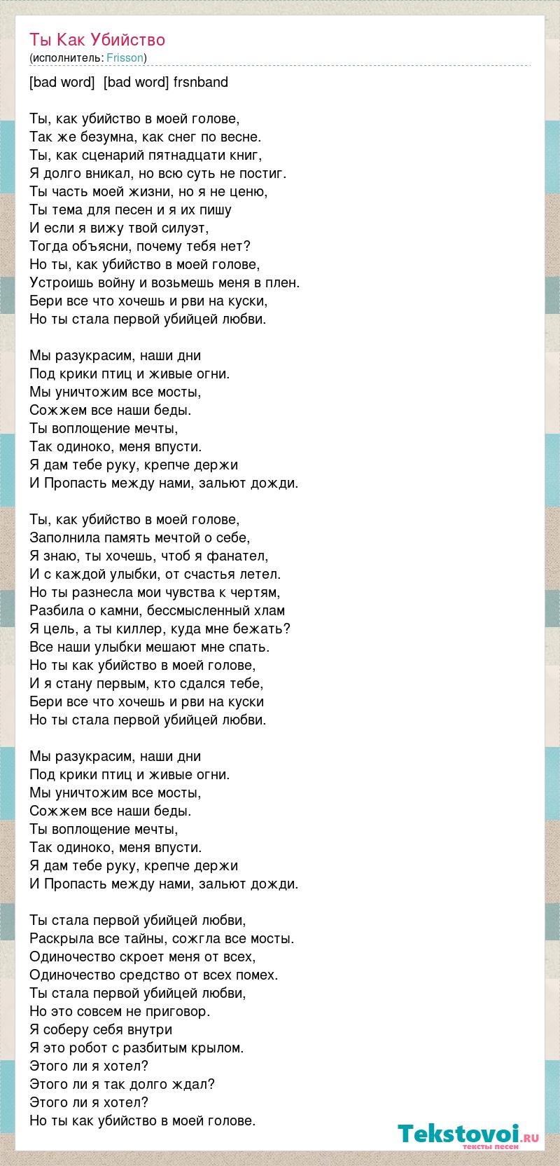 [bad word] [bad word] frsnband Ты, как убийство в моей голове, Так же безумна, как снег по весне. Ты, как сценарий пятнадцати книг, Я долго вникал, но всю суть не постиг. Ты часть моей жизни, но я не ценю, Ты тема для песен и я их пишу И если я вижу твой силуэт, Тогда объясни, почему тебя нет? Но ты, как убийство в моей голове, Устроишь войну и возьмешь меня в плен. Бери все что хочешь и рви на куски, Но ты стала первой убийцей любви. Мы разукрасим, наши дни Под крики птиц и живые огни. Мы уничтожим все мосты, Сожжем все наши беды. Ты воплощение мечты, Так одиноко, меня впусти. Я дам тебе руку, крепче держи И Пропасть между нами, зальют дожди. Ты, как убийство в моей голове, Заполнила память мечтой о себе, Я знаю, ты хочешь, чтоб я фанател, И с каждой улыбки, от счастья летел. Но ты разнесла мои чувства к чертям, Разбила о камни, бессмысленный хлам Я цель, а ты киллер, куда мне бежать? Все наши улыбки мешают мне спать. Но ты как убийство в моей голове, И я стану первым, кто сдался тебе, Бери все что хочешь и рви на куски Но ты стала первой убийцей любви. Мы разукрасим, наши дни Под крики птиц и живые огни. Мы уничтожим все мосты, Сожжем все наши беды. Ты воплощение мечты, Так одиноко, меня впусти. Я дам тебе руку, крепче держи И Пропасть между нами, зальют дожди. Ты стала первой убийцей любви, Раскрыла все тайны, сожгла все мосты. Одиночество скроет меня от всех, Одиночество средство от всех помех. Ты стала первой убийцей любви, Но это совсем не приговор. Я соберу себя внутри Я это робот с разбитым крылом. Этого ли я хотел? Этого ли я так долго ждал? Этого ли я хотел? Но ты как убийство в моей голове.