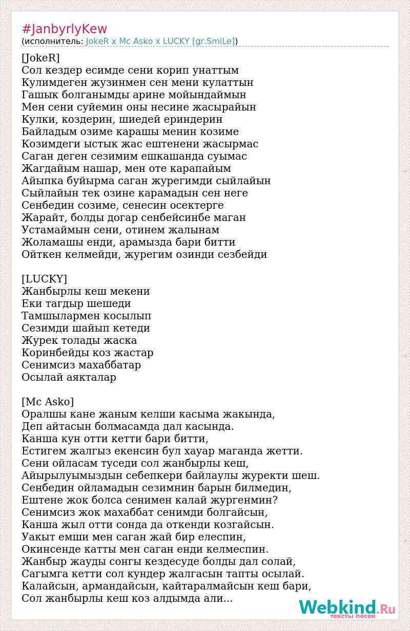 [JokeR] Сол кездер есимде сени корип унаттым Кулимдеген жузинмен сен мени кулаттын Гашык болганымды арине мойындаймын Мен сени суйемин оны несине жасырайын Кулки, коздерин, шиедей ериндерин Байладым озиме карашы менин козиме Козимдеги ыстык жас ештенени жасырмас Саган деген сезимим ешкашанда суымас Жагдайым нашар, мен оте карапайым Айыпка буйырма саган журегимди сыйлайын Сыйлайын тек озине карамадын сен неге Сенбедин созиме, сенесин осектерге Жарайт, болды догар сенбейсинбе маган Устамаймын сени, отинем жалынам Жоламашы енди, арамызда бари битти Ойткен келмейди, журегим озинди сезбейди [LUCKY] Жанбырлы кеш мекени Еки тагдыр шешеди Тамшылармен косылып Сезимди шайып кетеди Журек толады жаска Коринбейды коз жастар Сенимсиз махаббатар Осылай аякталар [Mc Asko] Оралшы кане жаным келши касыма жакында, Деп айтасын болмасамда дал касында. Канша кун отти кетти бари битти, Естигем жалгыз екенсин бул хауар маганда жетти. Сени ойласам туседи сол жанбырлы кеш, Айырылуымыздын себепкери байлаулы журекти шеш. Сенбедин ойламадын сезимнин барын билмедин, Ештене жок болса сенимен калай жургенмин? Сенимсиз жок махаббат сенимди болгайсын, Канша жыл отти сонда да откенди козгайсын. Уакыт емши мен cаган жай бир елеспин, Окинсенде катты мен саган енди келмеспин. Жанбыр жауды сонгы кездесуде болды дал солай, Сагымга кетти сол кундер жалгасын тапты осылай. Калайсын, армандайсын, кайтаралмайсын кеш бари, Сол жанбырлы кеш коз алдымда али...