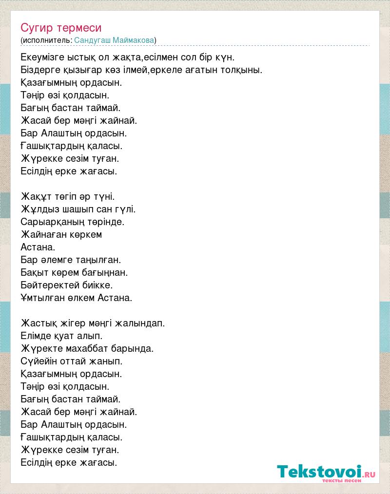 Екеумізге ыстық ол жақта,есілмен сол бір күн. Біздерге қызығар көз ілмей,еркеле ағатын толқыны. Қазағымның ордасын. Тәңір өзі қолдасын. Бағың бастан таймай. Жасай бер мәңгі жайнай. Бар Алаштың ордасын. Ғашықтардың қаласы. Жүрекке сезім туған. Есілдің ерке жағасы. Жақұт төгіп әр түні. Жұлдыз шашып сан гүлі. Сарыарқаның төрінде. Жайнаған көркем Астана. Бар әлемге таңылған. Бақыт көрем бағыңнан. Бәйтеректей биікке. Ұмтылған өлкем Астана. Жастық жігер мәңгі жалындап. Елімде қуат алып. Жүректе махаббат барында. Сүйейін оттай жанып. Қазағымның ордасын. Тәңір өзі қолдасын. Бағың бастан таймай. Жасай бер мәңгі жайнай. Бар Алаштың ордасын. Ғашықтардың қаласы. Жүрекке сезім туған. Есілдің ерке жағасы.
