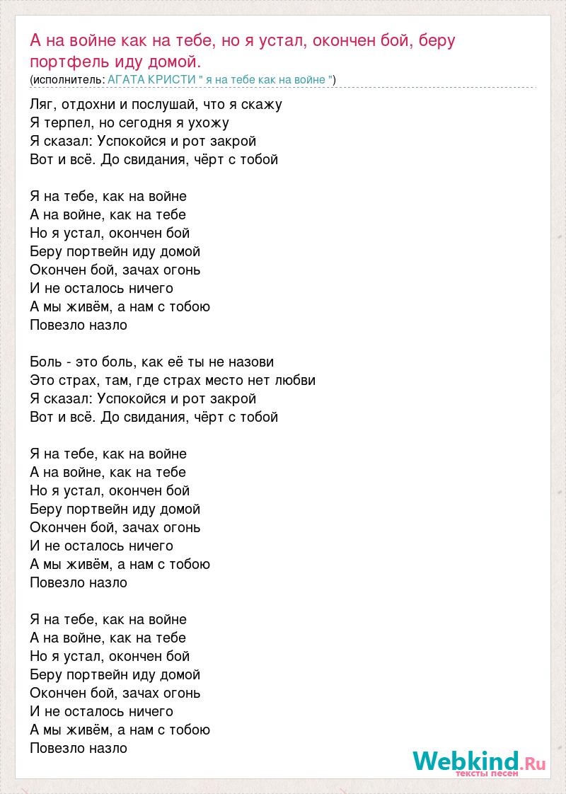 Главная→Исполнители→АГАТА КРИСТИ " я на тебе как на войне "→А на войне как на тебе, но я устал, окончен бой, беру портфель иду домой.