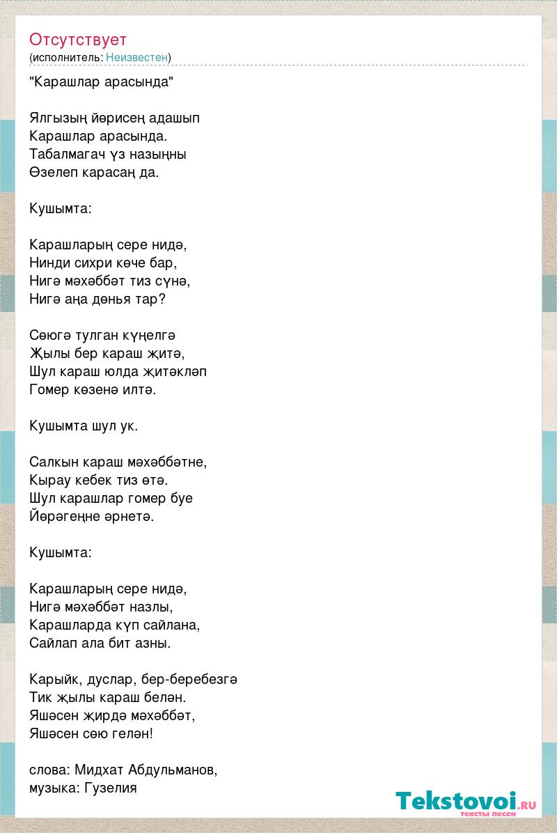 "Карашлар арасында" Ялгызың йөрисең адашып Карашлар арасында. Табалмагач үз назыңны Өзелеп карасаң да. Кушымта: Карашларың сере нидә, Нинди сихри көче бар, Нигә мәхәббәт тиз сүнә, Нигә аңа дөнья тар? Сөюгә тулган күңелгә Җылы бер караш җитә, Шул караш юлда җитәкләп Гомер көзенә илтә. Кушымта шул ук. Салкын караш мәхәббәтне, Кырау кебек тиз өтә. Шул карашлар гомер буе Йөрәгеңне әрнетә. Кушымта: Карашларың сере нидә, Нигә мәхәббәт назлы, Карашларда күп сайлана, Сайлап ала бит азны. Карыйк, дуслар, бер-беребезгә Тик җылы караш белән. Яшәсен җирдә мәхәббәт, Яшәсен сөю гелән! слова: Мидхат Абдульманов, музыка: Гузелия