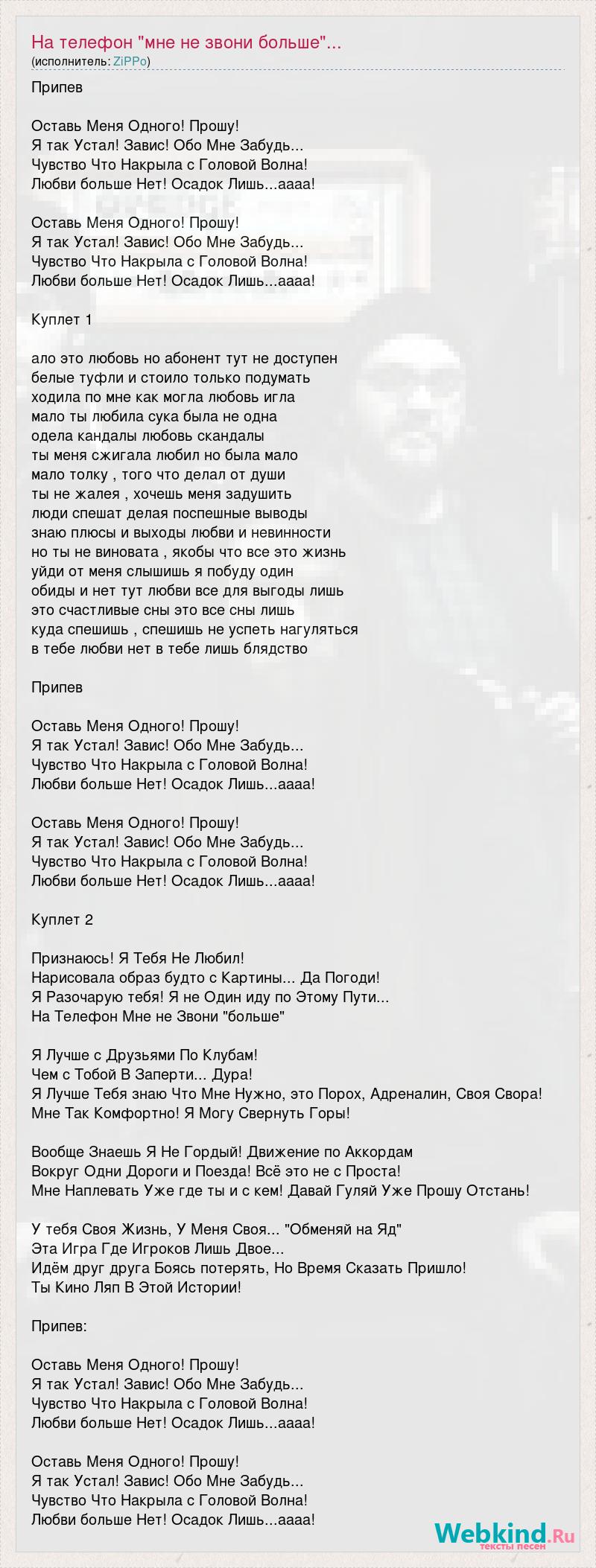 Припев Оставь Меня Одного! Прошу! Я так Устал! Завис! Обо Мне Забудь... Чувство Что Накрыла с Головой Волна! Любви больше Нет! Осадок Лишь...аааа! Оставь Меня Одного! Прошу! Я так Устал! Завис! Обо Мне Забудь... Чувство Что Накрыла с Головой Волна! Любви больше Нет! Осадок Лишь...аааа! Куплет 1 ало это любовь но абонент тут не доступен белые туфли и стоило только подумать ходила по мне как могла любовь игла мало ты любила сука была не одна одела кандалы любовь скандалы ты меня сжигала любил но была мало мало толку , того что делал от души ты не жалея , хочешь меня задушить люди спешат делая поспешные выводы знаю плюсы и выходы любви и невинности но ты не виновата , якобы что все это жизнь уйди от меня слышишь я побуду один обиды и нет тут любви все для выгоды лишь это счастливые сны это все сны лишь куда спешишь , спешишь не успеть нагуляться в тебе любви нет в тебе лишь блядство Припев Оставь Меня Одного! Прошу! Я так Устал! Завис! Обо Мне Забудь... Чувство Что Накрыла с Головой Волна! Любви больше Нет! Осадок Лишь...аааа! Оставь Меня Одного! Прошу! Я так Устал! Завис! Обо Мне Забудь... Чувство Что Накрыла с Головой Волна! Любви больше Нет! Осадок Лишь...аааа! Куплет 2 Признаюсь! Я Тебя Не Любил! Нарисовала образ будто с Картины... Да Погоди! Я Разочарую тебя! Я не Один иду по Этому Пути... На Телефон Мне не Звони "больше" Я Лучше с Друзьями По Клубам! Чем с Тобой В Заперти... Дура! Я Лучше Тебя знаю Что Мне Нужно, это Порох, Адреналин, Своя Свора! Мне Так Комфортно! Я Могу Свернуть Горы! Вообще Знаешь Я Не Гордый! Движение по Аккордам Вокруг Одни Дороги и Поезда! Всё это не с Проста! Мне Наплевать Уже где ты и с кем! Давай Гуляй Уже Прошу Отстань! У тебя Своя Жизнь, У Меня Своя... "Обменяй на Яд" Эта Игра Где Игроков Лишь Двое... Идём друг друга Боясь потерять, Но Время Сказать Пришло! Ты Кино Ляп В Этой Истории! Припев: Оставь Меня Одного! Прошу! Я так Устал! Завис! Обо Мне Забудь... Чувство Что Накрыла с Головой Волна! Любви больше Нет! Осадок Лишь...аааа! Оставь Меня Одного! Прошу! Я так Устал! Завис! Обо Мне Забудь... Чувство Что Накрыла с Головой Волна! Любви больше Нет! Осадок Лишь...аааа!