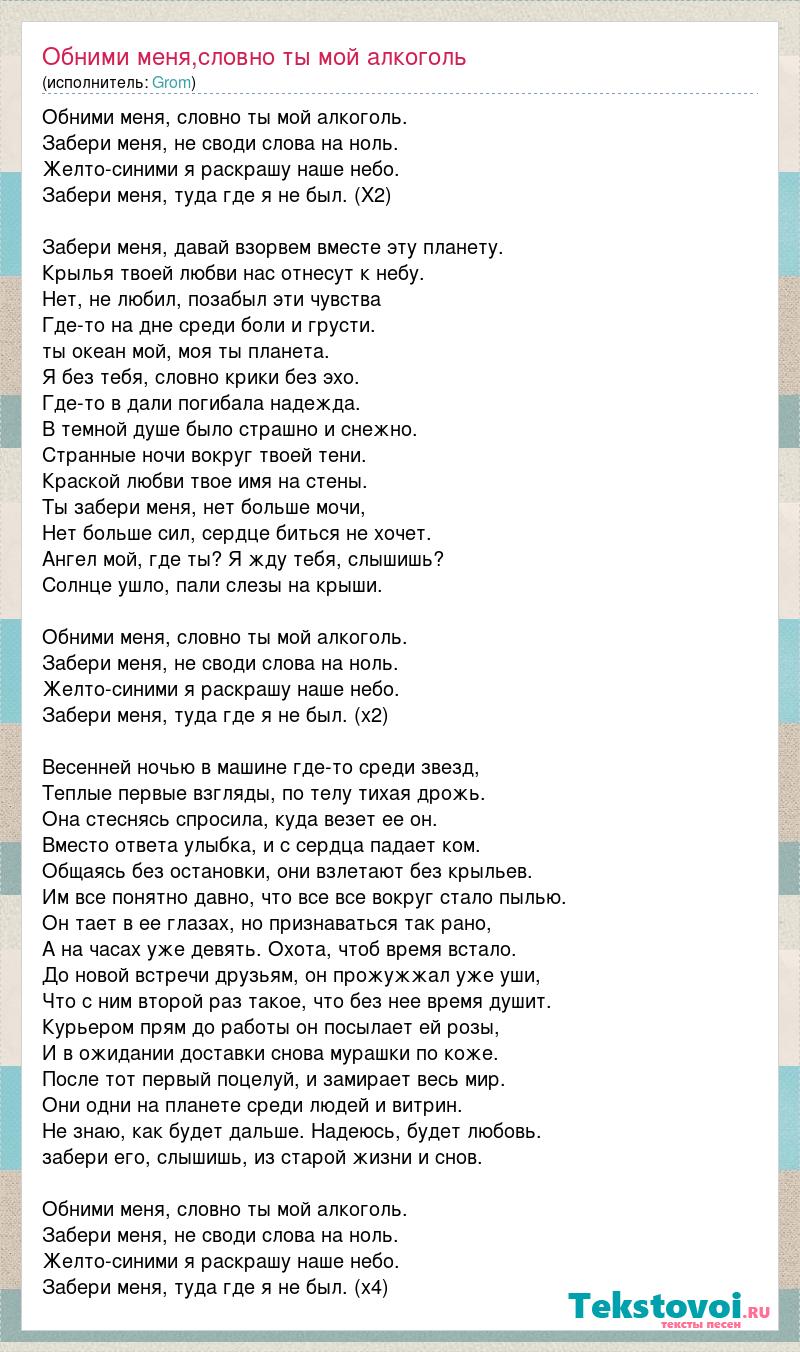 Обними меня, словно ты мой алкоголь. Забери меня, не своди слова на ноль. Желто-синими я раскрашу наше небо. Забери меня, туда где я не был. (X2) Забери меня, давай взорвем вместе эту планету. Крылья твоей любви нас отнесут к небу. Нет, не любил, позабыл эти чувства Где-то на дне среди боли и грусти. ты океан мой, моя ты планета. Я без тебя, словно крики без эхо. Где-то в дали погибала надежда. В темной душе было страшно и снежно. Странные ночи вокруг твоей тени. Краской любви твое имя на стены. Ты забери меня, нет больше мочи, Нет больше сил, сердце биться не хочет. Ангел мой, где ты? Я жду тебя, слышишь? Солнце ушло, пали слезы на крыши. Обними меня, словно ты мой алкоголь. Забери меня, не своди слова на ноль. Желто-синими я раскрашу наше небо. Забери меня, туда где я не был. (x2) Весенней ночью в машине где-то среди звезд, Теплые первые взгляды, по телу тихая дрожь. Она стеснясь спросила, куда везет ее он. Вместо ответа улыбка, и с сердца падает ком. Общаясь без остановки, они взлетают без крыльев. Им все понятно давно, что все все вокруг стало пылью. Он тает в ее глазах, но признаваться так рано, А на часах уже девять. Охота, чтоб время встало. До новой встречи друзьям, он прожужжал уже уши, Что с ним второй раз такое, что без нее время душит. Курьером прям до работы он посылает ей розы, И в ожидании доставки снова мурашки по коже. После тот первый поцелуй, и замирает весь мир. Они одни на планете среди людей и витрин. Не знаю, как будет дальше. Надеюсь, будет любовь. забери его, слышишь, из старой жизни и снов. Обними меня, словно ты мой алкоголь. Забери меня, не своди слова на ноль. Желто-синими я раскрашу наше небо. Забери меня, туда где я не был. (x4)