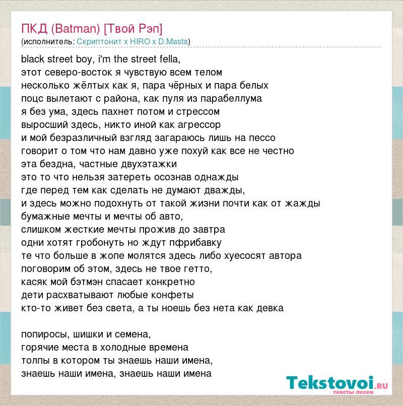 black street boy, i'm the street fella, этот северо-восток я чувствую всем телом несколько жёлтых как я, пара чёрных и пара белых поцс вылетают с района, как пуля из парабеллума я без ума, здесь пахнет потом и стрессом выросший здесь, никто иной как агрессор и мой безразличный взгляд загараюсь лишь на пессо говорит о том что нам давно уже похуй как все не честно эта бездна, частные двухэтажки это то что нельзя затереть осознав однажды где перед тем как сделать не думают дважды, и здесь можно подохнуть от такой жизни почти как от жажды бумажные мечты и мечты об авто, слишком жесткие мечты прожив до завтра одни хотят гробонуть но ждут пфрибавку те что больше в жопе молятся здесь либо хуесосят автора поговорим об этом, здесь не твое гетто, касяк мой бэтмэн спасает конкретно дети расхватывают любые конфеты кто-то живет без света, а ты ноешь без нета как девка попиросы, шишки и семена, горячие места в холодные времена толпы в котором ты знаешь наши имена, знаешь наши имена, знаешь наши имена