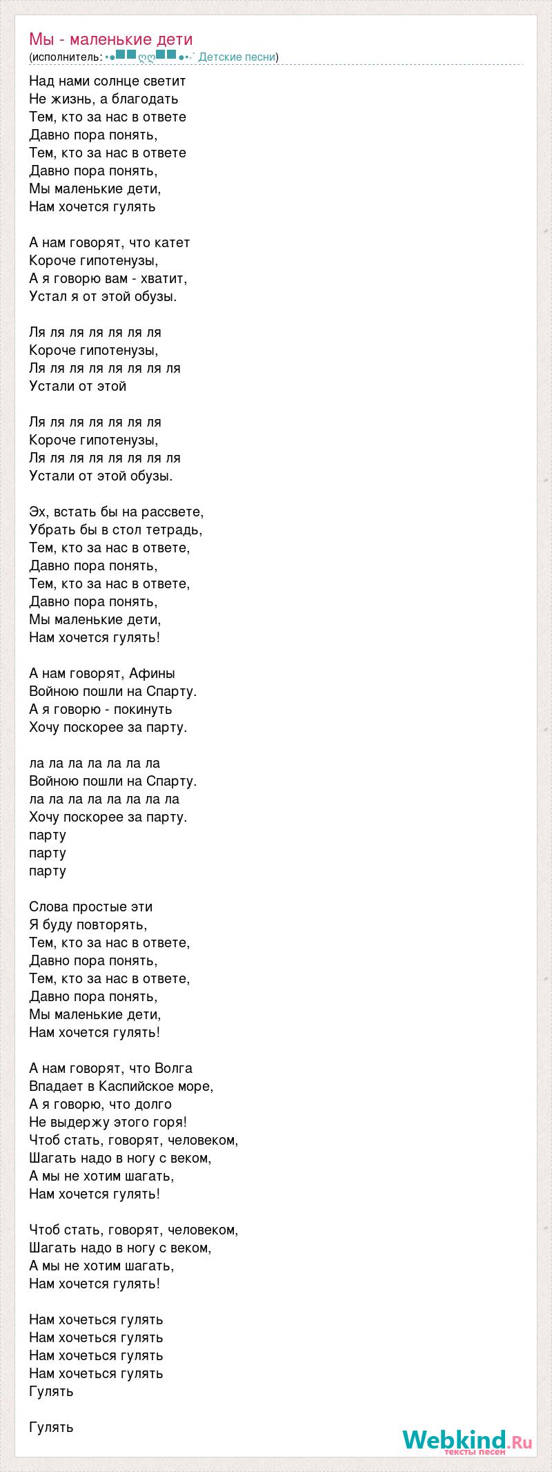 Над нами солнце светит Не жизнь, а благодать Тем, кто за нас в ответе Давно пора понять, Тем, кто за нас в ответе Давно пора понять, Мы маленькие дети, Нам хочется гулять А нам говорят, что катет Короче гипотенузы, А я говорю вам - хватит, Устал я от этой обузы. Ля ля ля ля ля ля ля Короче гипотенузы, Ля ля ля ля ля ля ля ля Устали от этой Ля ля ля ля ля ля ля Короче гипотенузы, Ля ля ля ля ля ля ля ля Устали от этой обузы. Эх, встать бы на расcвете, Убрать бы в стол тетрадь, Тем, кто за нас в ответе, Давно пора понять, Тем, кто за нас в ответе, Давно пора понять, Мы маленькие дети, Нам хочется гулять! А нам говорят, Афины Войною пошли на Спарту. А я говорю - покинуть Хочу поскорее за парту. ла ла ла ла ла ла ла Войною пошли на Спарту. ла ла ла ла ла ла ла ла Хочу поскорее за парту. парту парту парту Слова простые эти Я буду повторять, Тем, кто за нас в ответе, Давно пора понять, Тем, кто за нас в ответе, Давно пора понять, Мы маленькие дети, Нам хочется гулять! А нам говорят, что Волга Впадает в Каспийское море, А я говорю, что долго Не выдержу этого горя! Чтоб стать, говорят, человеком, Шагать надо в ногу с веком, А мы не хотим шагать, Нам хочется гулять! Чтоб стать, говорят, человеком, Шагать надо в ногу с веком, А мы не хотим шагать, Нам хочется гулять! Нам хочеться гулять Нам хочеться гулять Нам хочеться гулять Нам хочеться гулять Гулять Гулять
