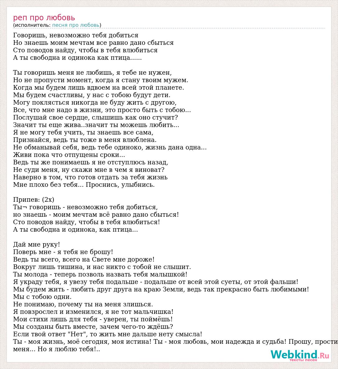 Говоришь, невозможно тебя добиться Но знаешь моим мечтам все равно дано сбыться Сто поводов найду, чтобы в тебя влюбиться А ты свободна и одинока как птица...... Ты говоришь меня не любишь, я тебе не нужен, Но не пропусти момент, когда я стану твоим мужем. Когда мы будем лишь вдвоем на всей этой планете. Мы будем счастливы, у нас с тобою будут дети. Могу поклясться никогда не буду жить с другою, Все, что мне надо в жизни, это просто быть с тобою... Послушай свое сердце, слышишь как оно стучит? Значит ты еще жива..значит ты можешь любить... Я не могу тебя учить, ты знаешь все сама, Признайся, ведь ты тоже в меня влюблена. Не обманывай себя, ведь тебе одиноко, жизнь дана одна... Живи пока что отпущены сроки... Ведь ты же понимаешь я не отступлюсь назад, Не суди меня, ну скажи мне в чем я виноват? Наверно в том, что готов отдать за тебя жизнь Мне плохо без тебя... Проснись, улыбнись. Припев: (2х) Ты¬ говоришь - невозможно тебя добиться, но знаешь - моим мечтам всё равно дано сбыться! Сто поводов найду, чтобы в тебя влюбиться! А ты свободна и одинока, как птица... Дай мне руку! Поверь мне - я тебя не брошу! Ведь ты всего, всего на Свете мне дороже! Вокруг лишь тишина, и нас никто с тобой не слышит. Ты молода - теперь позволь назвать тебя малышкой! Я украду тебя, я увезу тебя подальше - подальше от всей этой суеты, от этой фальши! Мы будем жить - любить друг друга на краю Земли, ведь так прекрасно быть любимыми! Мы с тобою одни. Не понимаю, почему ты на меня злишься. Я повзрослел и изменился, я не тот мальчишка! Мои стихи лишь для тебя - уверен, ты поймёшь! Мы созданы быть вместе, зачем чего-то ждёшь? Если твой ответ "Нет", то жить мне дальше нету смысла! Ты - моя жизнь, моё сегодня, моя истина! Ты - моя любовь, мои надежда и судьба! Прошу, прости меня... Но я люблю тебя!..
