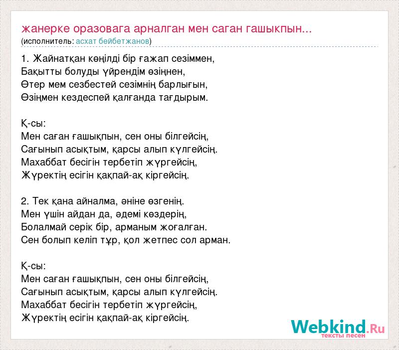1. Жайнатқан көңілді бір ғажап сезіммен, Бақытты болуды үйрендім өзіңнен, Өтер мем сезбестей сезімнің барлығын, Өзіңмен кездеспей қалғанда тағдырым. Қ-сы: Мен саған ғашықпын, сен оны білгейсің, Сағынып асықтым, қарсы алып күлгейсің. Махаббат бесігін тербетіп жүргейсің, Жүректің есігін қақпай-ақ кіргейсің. 2. Тек қана айналма, әніне өзгенің. Мен үшін айдан да, әдемі көздерің, Болалмай серік бір, арманым жоғалған. Сен болып келіп тұр, қол жетпес сол арман. Қ-сы: Мен саған ғашықпын, сен оны білгейсің, Сағынып асықтым, қарсы алып күлгейсің. Махаббат бесігін тербетіп жүргейсің, Жүректің есігін қақпай-ақ кіргейсің.