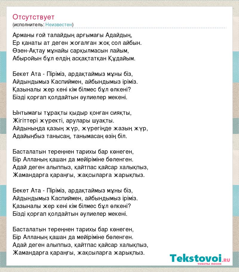 Арманы ғой талайдың арғымағы Адайдың, Ер қанаты ат деген жоғалған жоқ сол айбын. Өзен-Ақтау мұнайы сарқылмасын лайым, Абыройын бұл елдің асқақтатқан Құдайым. Бекет Ата - Піріміз, ардақтаймыз мұны біз, Айдындымыз Каспиймен, айбындымыз іріміз. Қазыналы жер кені кім білмес бұл өлкені? Бізді қорғап қолдайтын әулиелер мекені. Ынтымағы тұрақты қыдыр қонған сияқты, Жігіттері жүректі, арулары шуақты. Айдыныңда қазың жүр, жүрегіңде жазың жүр, Адайыңбыз танысаң, танымасаң өзің біл. Басталатын тереңнен тарихы бар көнеген, Бір Алланың қашан да мейіріміне бөленген. Адай деген алыппыз, қайтпас қайсар халықпыз, Жамандарға қараңғы, жақсыларға жарықпыз. Бекет Ата - Піріміз, ардақтаймыз мұны біз, Айдындымыз Каспиймен, айбындымыз іріміз. Қазыналы жер кені кім білмес бұл өлкені? Бізді қорғап қолдайтын әулиелер мекені. Басталатын тереңнен тарихы бар көнеген, Бір Алланың қашан да мейіріміне бөленген. Адай деген алыппыз, қайтпас қайсар халықпыз, Жамандарға қараңғы, жақсыларға жарықпыз.