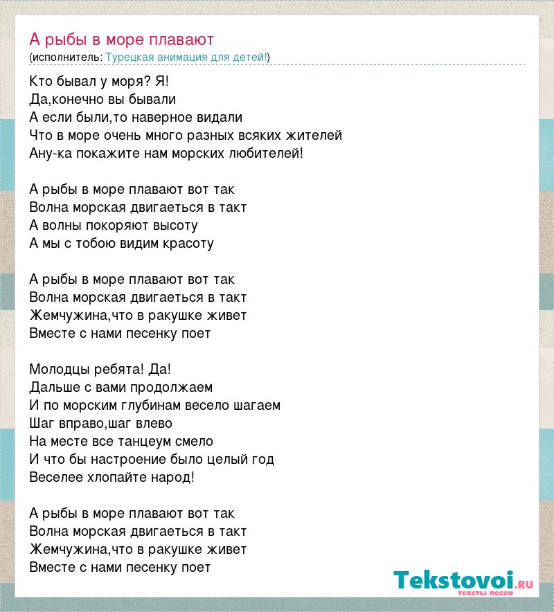 Кто бывал у моря? Я! Да,конечно вы бывали А если были,то наверное видали Что в море очень много разных всяких жителей Ану-ка покажите нам морских любителей! А рыбы в море плавают вот так Волна морская двигаеться в такт А волны покоряют высоту А мы с тобою видим красоту А рыбы в море плавают вот так Волна морская двигаеться в такт Жемчужина,что в ракушке живет Вместе с нами песенку поет Молодцы ребята! Да! Дальше с вами продолжаем И по морским глубинам весело шагаем Шаг вправо,шаг влево На месте все танцеум смело И что бы настроение было целый год Веселее хлопайте народ! А рыбы в море плавают вот так Волна морская двигаеться в такт Жемчужина,что в ракушке живет Вместе с нами песенку поет