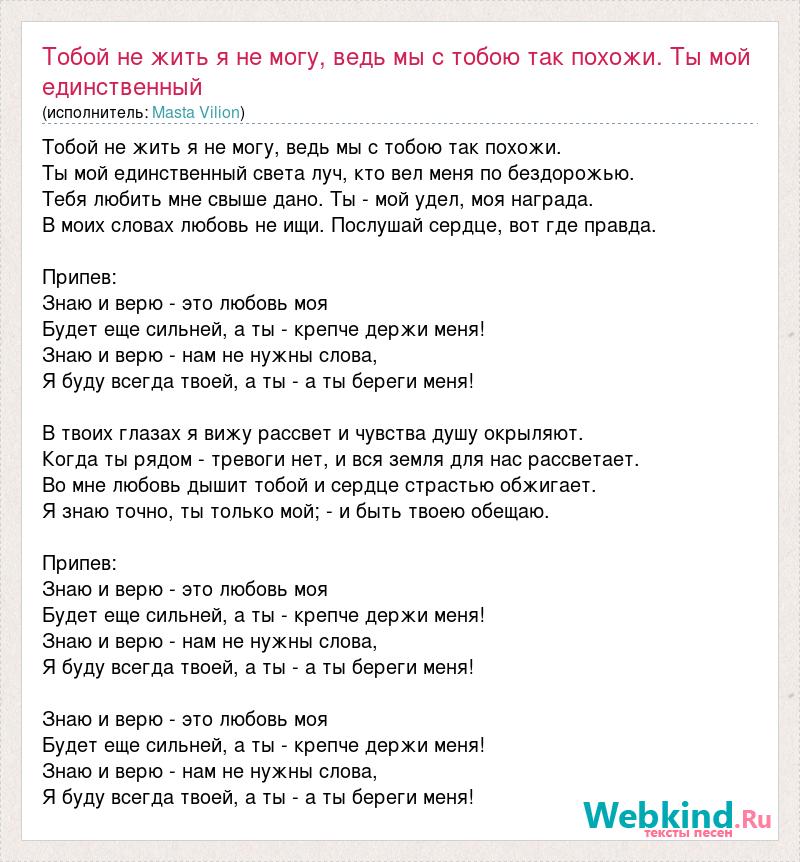 Тобой не жить я не могу, ведь мы с тобою так похожи. Ты мой единственный света луч, кто вел меня по бездорожью. Тебя любить мне свыше дано. Ты - мой удел, моя награда. В моих словах любовь не ищи. Послушай сердце, вот где правда. Припев: Знаю и верю - это любовь моя Будет еще сильней, а ты - крепче держи меня! Знаю и верю - нам не нужны слова, Я буду всегда твоей, а ты - а ты береги меня! В твоих глазах я вижу рассвет и чувства душу окрыляют. Когда ты рядом - тревоги нет, и вся земля для нас рассветает. Во мне любовь дышит тобой и сердце страстью обжигает. Я знаю точно, ты только мой; - и быть твоею обещаю. Припев: Знаю и верю - это любовь моя Будет еще сильней, а ты - крепче держи меня! Знаю и верю - нам не нужны слова, Я буду всегда твоей, а ты - а ты береги меня! Знаю и верю - это любовь моя Будет еще сильней, а ты - крепче держи меня! Знаю и верю - нам не нужны слова, Я буду всегда твоей, а ты - а ты береги меня!
