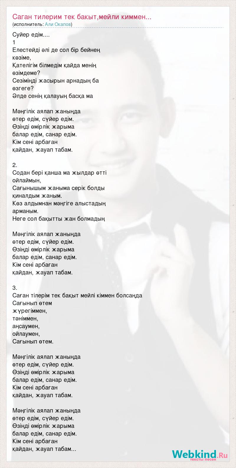 Суйер едім.... 1 Елестейді әлі де сол бір бейнең көзіме, Қателігім білмедім қайда менің өзімдеме? Сезіміңді жасырын арнадың ба өзгеге? Әлде сенің қалауың басқа ма Мәңгілік аялап жаныңда өтер едім, сүйер едім. Өзіңді өмірлік жарыма балар едім, санар едім. Кім сені арбаған қайдан, жауап табам. 2. Содан бері қанша ма жылдар өтті ойлаймын, Сағынышым жаныма серік болды қиналдым жаным. Көз алдымнан мәңгіге алыстадың арманым. Неге сол бақытты жан болмадың Мәңгілік аялап жаныңда өтер едім, сүйер едім. Өзіңді өмірлік жарыма балар едім, санар едім. Кім сені арбаған қайдан, жауап табам. 3. Саған тілерім тек бақыт мейлі кіммен болсаңда Сағынып өтем жүрегіммен, тәніммен, аңсаумен, ойлаумен, Сағынып өтем. Мәңгілік аялап жаныңда өтер едім, сүйер едім. Өзіңді өмірлік жарыма балар едім, санар едім. Кім сені арбаған қайдан, жауап табам. Мәңгілік аялап жаныңда өтер едім, сүйер едім. Өзіңді өмірлік жарыма балар едім, санар едім. Кім сені арбаған қайдан, жауап табам...