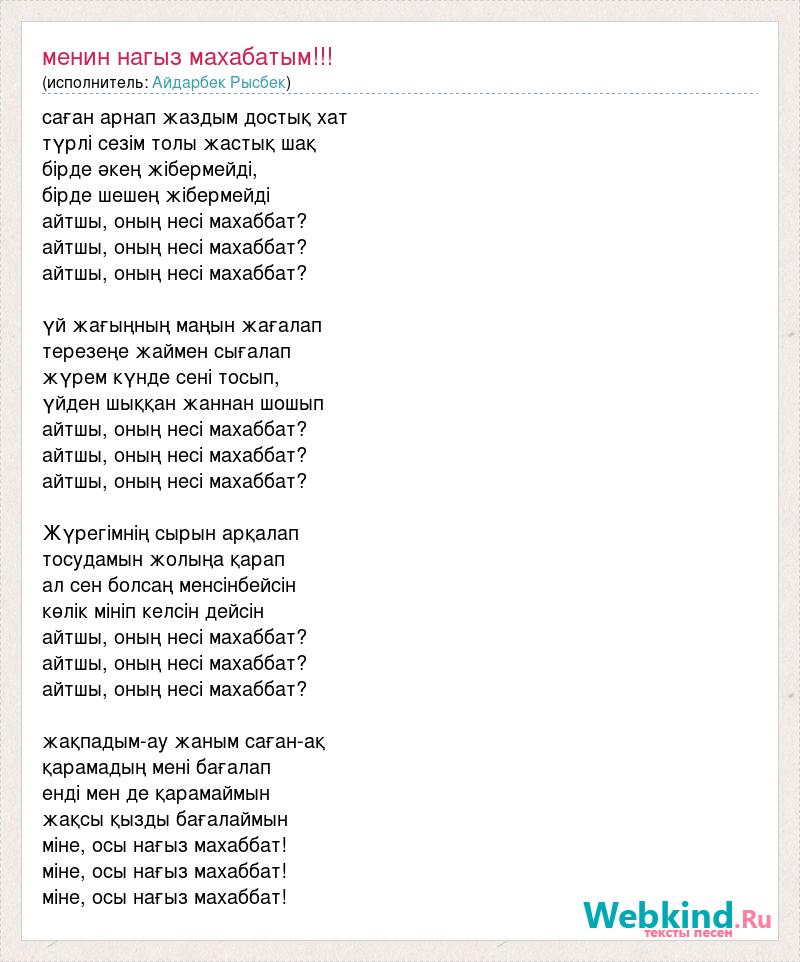 саған арнап жаздым достық хат түрлі сезім толы жастық шақ бірде әкең жібермейді, бірде шешең жібермейді айтшы, оның несі махаббат? айтшы, оның несі махаббат? айтшы, оның несі махаббат? үй жағыңның маңын жағалап терезеңе жаймен сығалап жүрем күнде сені тосып, үйден шыққан жаннан шошып айтшы, оның несі махаббат? айтшы, оның несі махаббат? айтшы, оның несі махаббат? Жүрегімнің сырын арқалап тосудамын жолыңа қарап ал сен болсаң менсінбейсін көлік мініп келсін дейсін айтшы, оның несі махаббат? айтшы, оның несі махаббат? айтшы, оның несі махаббат? жақпадым-ау жаным саған-ақ қарамадың мені бағалап енді мен де қарамаймын жақсы қызды бағалаймын міне, осы нағыз махаббат! міне, осы нағыз махаббат! міне, осы нағыз махаббат!
