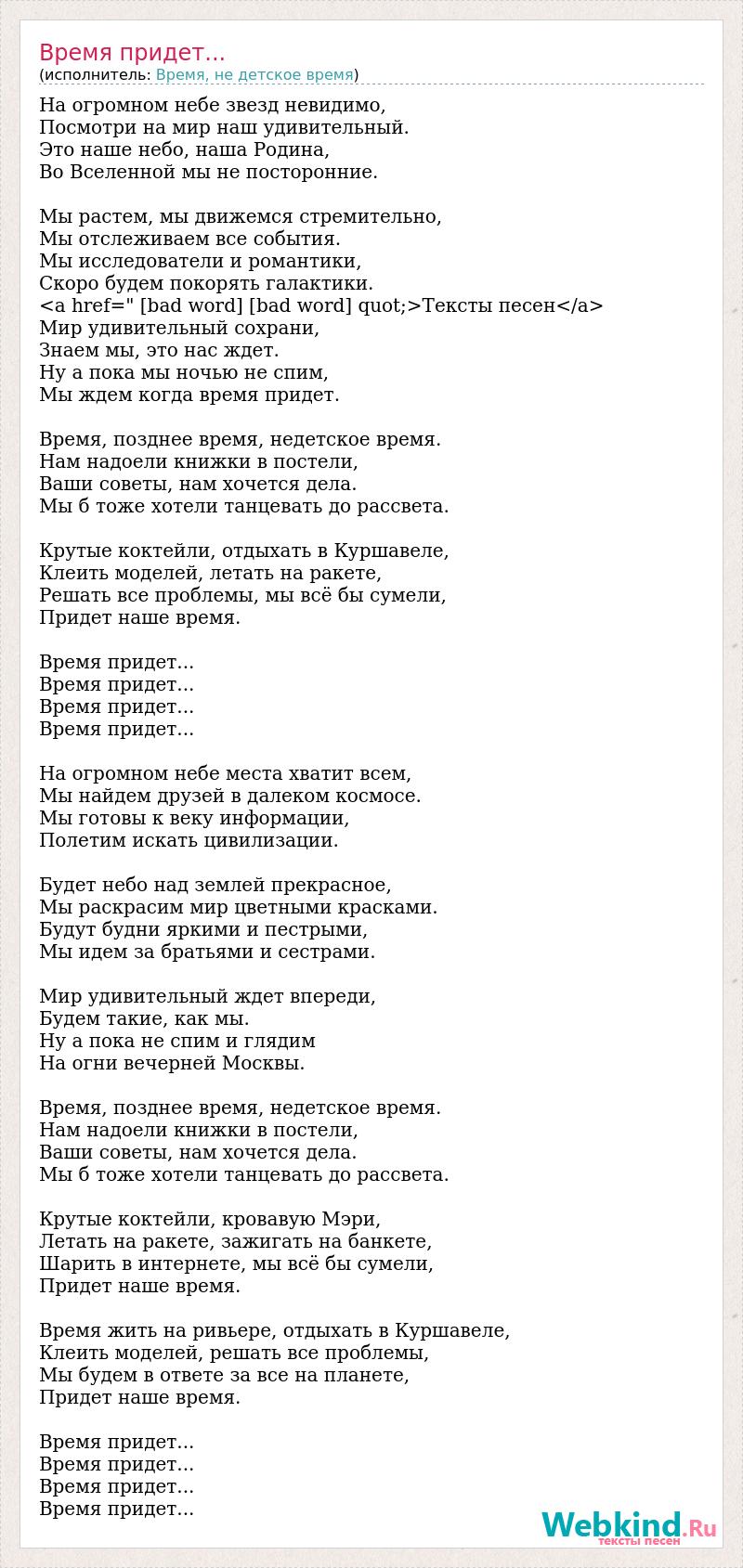 На огромном небе звезд невидимо, Посмотри на мир наш удивительный. Это наше небо, наша Родина, Во Вселенной мы не посторонние. Мы растем, мы движемся стремительно, Мы отслеживаем все события. Мы исследователи и романтики, Скоро будем покорять галактики. <a href=" [bad word] [bad word] quot;>Тексты песен</a> Мир удивительный сохрани, Знаем мы, это нас ждет. Ну а пока мы ночью не спим, Мы ждем когда время придет. Время, позднее время, недетское время. Нам надоели книжки в постели, Ваши советы, нам хочется дела. Мы б тоже хотели танцевать до рассвета. Крутые коктейли, отдыхать в Куршавеле, Клеить моделей, летать на ракете, Решать все проблемы, мы всё бы сумели, Придет наше время. Время придет... Время придет... Время придет... Время придет... На огромном небе места хватит всем, Мы найдем друзей в далеком космосе. Мы готовы к веку информации, Полетим искать цивилизации. Будет небо над землей прекрасное, Мы раскрасим мир цветными красками. Будут будни яркими и пестрыми, Мы идем за братьями и сестрами. Мир удивительный ждет впереди, Будем такие, как мы. Ну а пока не спим и глядим На огни вечерней Москвы. Время, позднее время, недетское время. Нам надоели книжки в постели, Ваши советы, нам хочется дела. Мы б тоже хотели танцевать до рассвета. Крутые коктейли, кровавую Мэри, Летать на ракете, зажигать на банкете, Шарить в интернете, мы всё бы сумели, Придет наше время. Время жить на ривьере, отдыхать в Куршавеле, Клеить моделей, решать все проблемы, Мы будем в ответе за все на планете, Придет наше время. Время придет... Время придет... Время придет... Время придет...