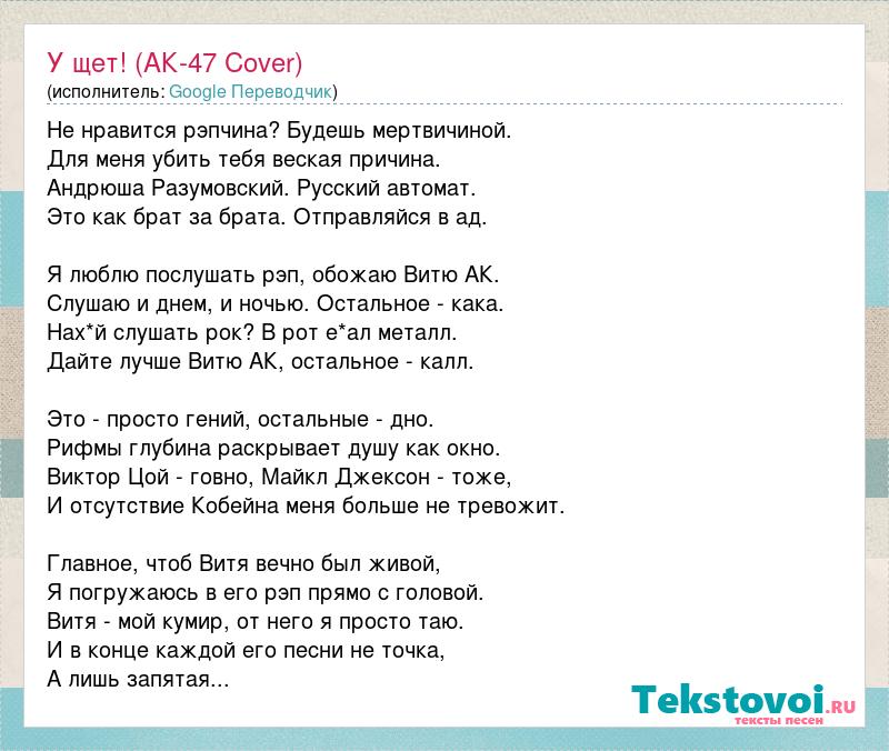 Не нравится рэпчина? Будешь мертвичиной. Для меня убить тебя веская причина. Андрюша Разумовский. Русский автомат. Это как брат за брата. Отправляйся в ад. Я люблю послушать рэп, обожаю Витю АК. Слушаю и днем, и ночью. Остальное - кака. Нах*й слушать рок? В рот е*ал металл. Дайте лучше Витю АК, остальное - калл. Это - просто гений, остальные - дно. Рифмы глубина раскрывает душу как окно. Виктор Цой - говно, Майкл Джексон - тоже, И отсутствие Кобейна меня больше не тревожит. Главное, чтоб Витя вечно был живой, Я погружаюсь в его рэп прямо с головой. Витя - мой кумир, от него я просто таю. И в конце каждой его песни не точка, А лишь запятая...