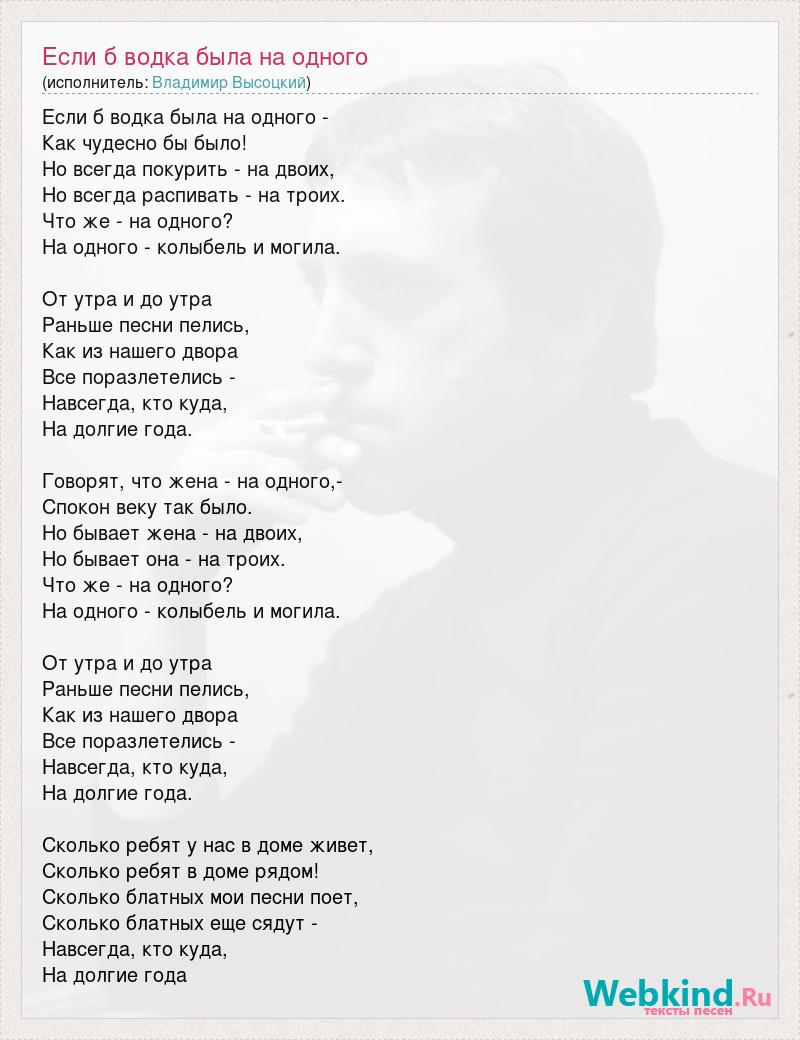 Если б водка была на одного - Как чудесно бы было! Но всегда покурить - на двоих, Но всегда распивать - на троих. Что же - на одного? На одного - колыбель и могила. От утра и до утра Раньше песни пелись, Как из нашего двора Все поразлетелись - Навсегда, кто куда, На долгие года. Говорят, что жена - на одного,- Спокон веку так было. Но бывает жена - на двоих, Но бывает она - на троих. Что же - на одного? На одного - колыбель и могила. От утра и до утра Раньше песни пелись, Как из нашего двора Все поразлетелись - Навсегда, кто куда, На долгие года. Сколько ребят у нас в доме живет, Сколько ребят в доме рядом! Сколько блатных мои песни поет, Сколько блатных еще сядут - Навсегда, кто куда, На долгие года