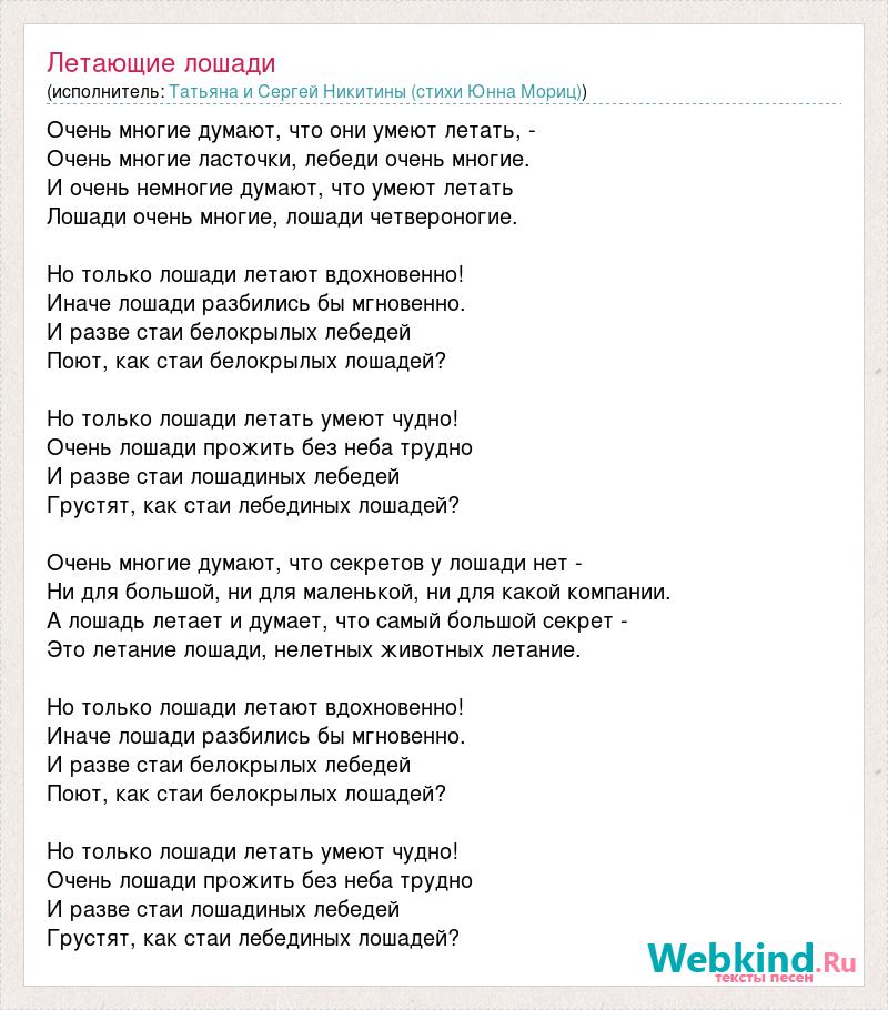 Очень многие думают, что они умеют летать, - Очень многие ласточки, лебеди очень многие. И очень немногие думают, что умеют летать Лошади очень многие, лошади четвероногие. Но только лошади летают вдохновенно! Иначе лошади разбились бы мгновенно. И разве стаи белокрылых лебедей Поют, как стаи белокрылых лошадей? Но только лошади летать умеют чудно! Очень лошади прожить без неба трудно И разве стаи лошадиных лебедей Грустят, как стаи лебединых лошадей? Очень многие думают, что секретов у лошади нет - Ни для большой, ни для маленькой, ни для какой компании. А лошадь летает и думает, что самый большой секрет - Это летание лошади, нелетных животных летание. Но только лошади летают вдохновенно! Иначе лошади разбились бы мгновенно. И разве стаи белокрылых лебедей Поют, как стаи белокрылых лошадей? Но только лошади летать умеют чудно! Очень лошади прожить без неба трудно И разве стаи лошадиных лебедей Грустят, как стаи лебединых лошадей?