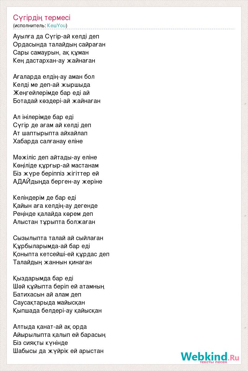 Ауылға да Сүгір-ай келді деп Ордасында талайдың сайраған Сары самаурын, ақ құман Кең дастархан-ау жайнаған Ағаларда елдің-ау аман бол Келді ме деп-ай жыршыда Жеңгейлерімде бар еді ай Ботадай көздері-ай жайнаған Ал інілерімде бар еді Сүгір де ағам ай келді деп Ат шаптырыпта айхайлап Хабарда салғанау еліне Мәжіліс деп айтады-ау еліне Көңіліде құрғыр-ай мастанам Біз жүре беріппіз жігіттер ей АДАЙдыңда берген-ау жеріне Келіндерім де бар еді Қайын аға келдің-ау дегенде Реңінде қалайда көрем деп Алыстан тұрыпта болжаған Сызылыпта талай ай сыйлаған Құрбыларымда-ай бар еді Қоныпта кетсейші-ей құрдас деп Талайдың жаннын қинаған Қыздарымда бар еді Шәй құйыпта беріп ей атамның Батихасын ай алам деп Саусақтарыда майысқан Қыпшада белдері-ау қайысқан Алтыда қанат-ай ақ орда Айырылыпта қалып ей барасың Біз сияқты күнінде Шабысы да жүйрік ей арыстан