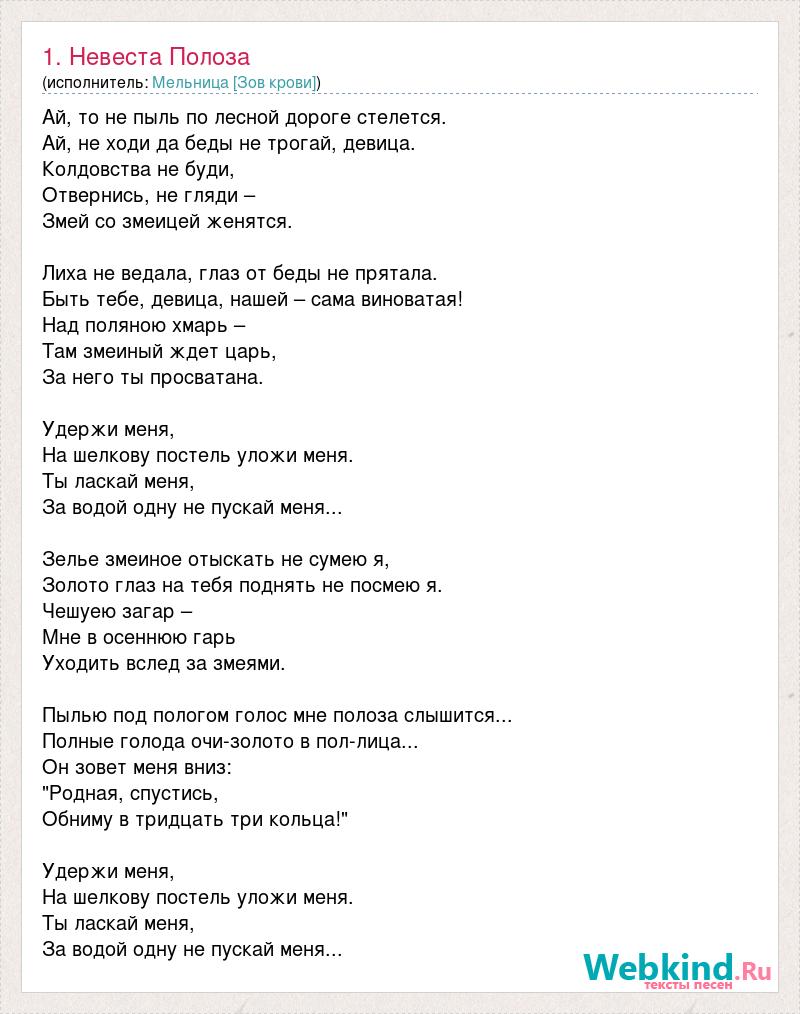 Ай, то не пыль по лесной дороге стелется. Ай, не ходи да беды не трогай, девица. Колдовства не буди, Отвернись, не гляди – Змей со змеицей женятся. Лиха не ведала, глаз от беды не прятала. Быть тебе, девица, нашей – сама виноватая! Над поляною хмарь – Там змеиный ждет царь, За него ты просватана. Удержи меня, На шелкову постель уложи меня. Ты ласкай меня, За водой одну не пускай меня... Зелье змеиное отыскать не сумею я, Золото глаз на тебя поднять не посмею я. Чешуею загар – Мне в осеннюю гарь Уходить вслед за змеями. Пылью под пологом голос мне полоза слышится... Полные голода очи-золото в пол-лица... Он зовет меня вниз: "Родная, спустись, Обниму в тридцать три кольца!" Удержи меня, На шелкову постель уложи меня. Ты ласкай меня, За водой одну не пускай меня...