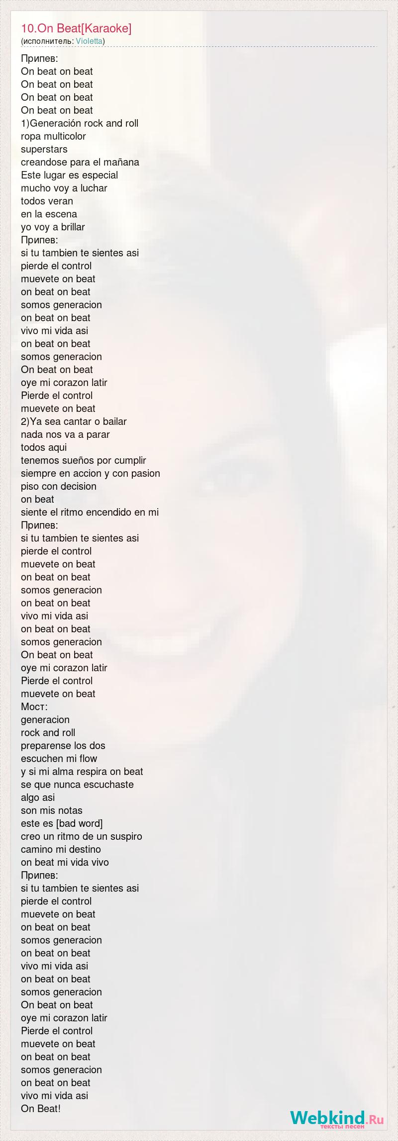 Припев: On beat on beat On beat on beat On beat on beat On beat on beat 1)Generación rock and roll ropa multicolor superstars creandose para el mañana Este lugar es especial mucho voy a luchar todos veran en la escena yo voy a brillar Припев: si tu tambien te sientes asi pierde el control muevete on beat on beat on beat somos generacion on beat on beat vivo mi vida asi on beat on beat somos generacion On beat on beat oye mi corazon latir Pierde el control muevete on beat 2)Ya sea cantar o bailar nada nos va a parar todos aqui tenemos sueños por cumplir siempre en accion y con pasion piso con decision on beat siente el ritmo encendido en mi Припев: si tu tambien te sientes asi pierde el control muevete on beat on beat on beat somos generacion on beat on beat vivo mi vida asi on beat on beat somos generacion On beat on beat oye mi corazon latir Pierde el control muevete on beat Мост: generacion rock and roll preparense los dos escuchen mi flow y si mi alma respira on beat se que nunca escuchaste algo asi son mis notas este es [bad word] creo un ritmo de un suspiro camino mi destino on beat mi vida vivo Припев: si tu tambien te sientes asi pierde el control muevete on beat on beat on beat somos generacion on beat on beat vivo mi vida asi on beat on beat somos generacion On beat on beat oye mi corazon latir Pierde el control muevete on beat on beat on beat somos generacion on beat on beat vivo mi vida asi On Beat!