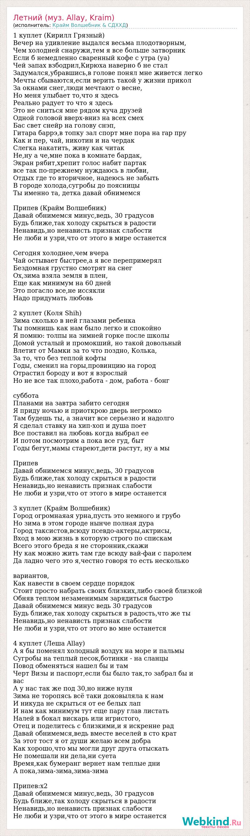 1 куплет (Кирилл Грязный) Вечер на удивление выдался весьма плодотворным, Чем холодней снаружи,тем я все больше затворник Если б немедленно сваренный кофе с утра (уа) Чей запах взбодрил,Кирюха наверно б не стал Задумался,убравшись,в голове понял мне живется легко Мечты сбываются,если верить такой у жизни прикол За окнами снег,люди мечтают о весне, Но меня улыбает то,что я здесь Реально радует то что я здесь Это не сниться мне рядом куча друзей Одной головой вверх-вниз на всех смех Бас свет снейр на голову снэп, Гитара баррэ,в топку зал спорт мне пора на rap пру Как и пер, чай, никотин и на чердак Слегка накатить, живу как читак Не,ну а че,мне пока в комнате бардак, Экран рябит,хрепит голос набит партак все так по-прежнему нуждаюсь в любви, Отдых где то вторичное, надеюсь не забыть В городе холода,сугробы до поясницы Ты именно та, детка давай обнимемся Припев (Крайм Волшебник) Давай обнимемся минус,ведь, 30 градусов Будь ближе,так холоду скрыться в радости Ненавидь,но ненависть признак слабости Не люби и узри,что от этого в мире останется Сегодня холоднее,чем вчера Чай остывает быстрее,а я все перепримерял Бездомная грустно смотрят на снег Ох,зима взяла земля в плен, Еще как минимум на 60 дней Это погасло все,не иссякли Надо придумать любовь 2 куплет (Коля Shih) Зима сколько в ней глазами ребенка Ты помнишь как нам было легко и спокойно Я помню: толпы на зимней горке после школы Домой усталый и промокший, но такой довольный Влетит от Мамки за то что поздно, Колька, За то, что без теплой кофты Годы, сменил на горы,провинцию на город Отрастил бороду и вот я взрослый Но не все так плохо,работа - дом, работа - бонг суббота Планами на завтра забито сегодня Я приду ночью и приоткрою дверь негромко Там будешь ты, а значит все серьезно и надолго Я сделал ставку на хип-хоп и душа поет Все поставил на любовь когда выбрал ее И потом посмотрим а пока все гуд, быт Годы бегут,мамы стареют,дети растут, ну а мы Припев Давай обнимемся минус,ведь, 30 градусов Будь ближе,так холоду скрыться в радости Ненавидь,но ненависть признак слабости Не люби и узри,что от этого в мире останется 3 куплет (Крайм Волшебник) Город огромнаяая урна,пусть это немного и грубо Но зима в этом городе нынче полная дура Город таксистов,всюду псевдо-актеры,актрисы, Вход в мою жизнь в которую строго по спискам Всего этого бреда я не сторонник,скажи Ну как можно жить там где всюду вай-фаи с паролем Да ладно чего это я,честно говоря то есть несколько вариантов, Как навести в своем сердце порядок Стоит просто набрать своих близких,либо своей близкой Обняв теплом незаменимым зарядиться быстро Давай обнимемся минус ведь 30 градусов Будь ближе,так холоду скрыться в радость,что же ты Ненавидь,но ненависть признак слабости Не люби и узри,что от этого во мне останется 4 куплет (Леша Allay) А я бы поменял холодный воздух на море и пальмы Сугробы на теплый песок,ботинки - на сланцы Повод обменяться нашел бы и там Черт Визы и паспорт,если бы было так,то забрал бы и вас А у нас так же под 30,но ниже нуля Зима не торопясь всё таки доковыляла к нам И никуда не скрыться от ее белых лап И нам как минимум тут еще пару глав листать Налей в бокал вискарь или игристого, Отец и поделитесь с близкими,и я искренне рад Давай обнимемся,ведь вместе веселей в сто крат За этот тост я от души желаю всем добра Как хорошо,что мы могли друг друга отыскат