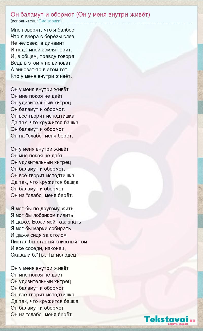 Мне говорят, что я балбес Что я вчера с берёзы слез Не человек, а динамит И подо мной земля горит. И, в общем, правду говоря Ведь в этом я не виноват А виноват-то в этом тот, Кто у меня внутри живёт. Он у меня внутри живёт Он мне покоя не даёт Он удивительный хитрец Он баламут и обормот. Он всё творит исподтишка Да так, что кружится башка Он баламут и обормот Он на "слабо" меня берёт. Он у меня внутри живёт Он мне покоя не даёт Он удивительный хитрец Он баламут и обормот. Он всё творит исподтишка Да так, что кружится башка Он баламут и обормот Он на "слабо" меня берёт. Я мог бы по другому жить. Я мог бы лобзиком пилить. И даже, Боже мой, как знать Я мог бы марки собирать И даже сидя за столом Листал бы старый книжный том И все соседи, наконец, Сказали б:"Ты. Ты молодец!" Он у меня внутри живёт Он мне покоя не даёт Он удивительный хитрец Он баламут и обормот Он всё творит исподтишка Да так, что кружится башка Он баламут и обормот Он на "слабо" меня берёт.