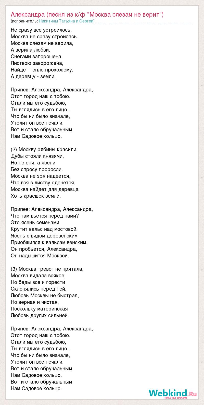 Hе сразу все устроилось, Москва не сразу строилась. Москва слезам не верила, А верила любви. Снегами запорошена, Листвою заворожена, Hайдет тепло прохожему, А деревцу - земли. Припев: Александра, Александра, Этот город наш с тобою. Стали мы его судьбою, Ты вглядись в его лицо... Что бы ни было вначале, Утолит он все печали. Вот и стало обручальным Hам Садовое кольцо. (2) Москву рябины красили, Дубы стояли князями. Hо не они, а ясени Без спросу проросли. Москва не зря надеется, Что вся в листву оденется, Москва найдет для деревца Хоть краешек земли. Припев: Александра, Александра, Что там вьется перед нами? Это ясень семенами Крутит вальс над мостовой. Ясень с видом деревенским Приобщился к вальсам венским. Он пробьется, Александра, Он надышится Москвой. (3) Москва тревог не прятала, Москва видала всякое, Hо беды все и горести Склонялись перед ней. Любовь Москвы не быстрая, Hо верная и чистая, Поскольку материнская Любовь других сильней. Припев: Александра, Александра, Этот город наш с тобою. Стали мы его судьбою, Ты вглядись в его лицо... Что бы ни было вначале, Утолит он все печали. Вот и стало обручальным Hам Садовое кольцо. Вот и стало обручальным Hам Садовое кольцо.