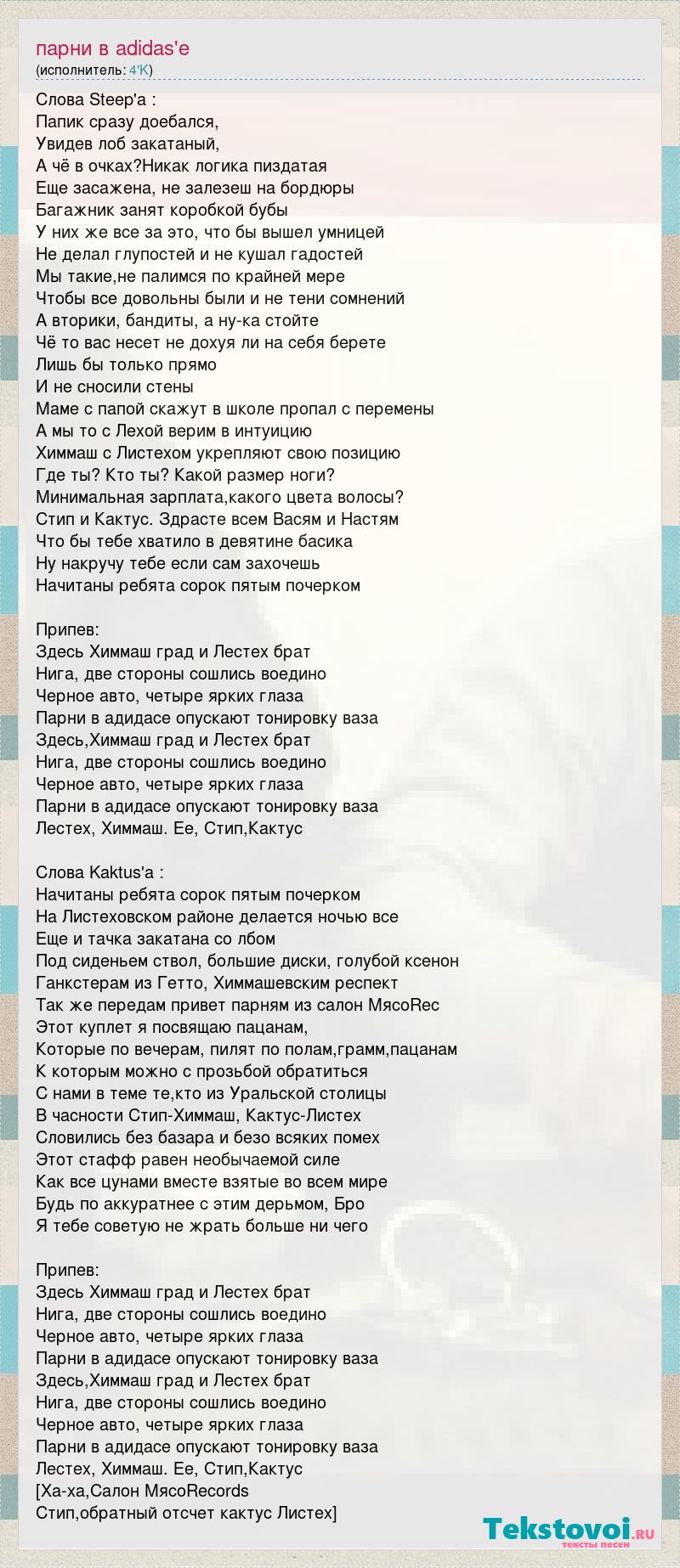 Cлова Steep'a : Папик сразу доебался, Увидев лоб закатаный, А чё в очках?Никак логика пиздатая Еще засажена, не залезеш на бордюры Багажник занят коробкой бубы У них же все за это, что бы вышел умницей Не делал глупостей и не кушал гадостей Мы такие,не палимся по крайней мере Чтобы все довольны были и не тени сомнений А вторики, бандиты, а ну-ка стойте Чё то вас несет не дохуя ли на себя берете Лишь бы только прямо И не сносили стены Маме с папой скажут в школе пропал с перемены А мы то с Лехой верим в интуицию Химмаш с Листехом укрепляют свою позицию Где ты? Кто ты? Какой размер ноги? Минимальная зарплата,какого цвета волосы? Стип и Кактус. Здрасте всем Васям и Настям Что бы тебе хватило в девятине басика Ну накручу тебе если сам захочешь Начитаны ребята сорок пятым почерком Припев: Здесь Химмаш град и Лестех брат Нига, две стороны сошлись воедино Черное авто, четыре ярких глаза Парни в адидасе опускают тонировку ваза Здесь,Химмаш град и Лестех брат Нига, две стороны сошлись воедино Черное авто, четыре ярких глаза Парни в адидасе опускают тонировку ваза Лестех, Химмаш. Ее, Стип,Кактус Слова Kaktus'a : Начитаны ребята сорок пятым почерком На Листеховском районе делается ночью все Еще и тачка закатана со лбом Под сиденьем ствол, большие диски, голубой ксенон Ганкстерам из Гетто, Химмашевским респект Так же передам привет парням из салон МясоRec Этот куплет я посвящаю пацанам, Которые по вечерам, пилят по полам,грамм,пацанам К которым можно с прозьбой обратиться С нами в теме те,кто из Уральской столицы В часности Стип-Химмаш, Кактус-Листех Словились без базара и безо всяких помех Этот стафф равен необычаемой силе Как все цунами вместе взятые во всем мире Будь по аккуратнее с этим дерьмом, Бро Я тебе советую не жрать больше ни чего Припев: Здесь Химмаш град и Лестех брат Нига, две стороны сошлись воедино Черное авто, четыре ярких глаза Парни в адидасе опускают тонировку ваза Здесь,Химмаш град и Лестех брат Нига, две стороны сошлись воедино Черное авто, четыре ярких глаза Парни в адидасе опускают тонировку ваза Лестех, Химмаш. Ее, Стип,Кактус [Ха-ха,Салон МясоRecords Стип,обратный отсчет кактус Листех]