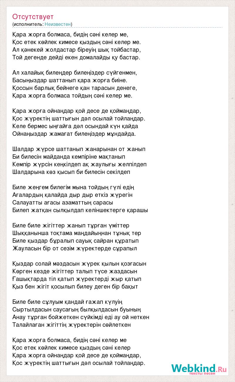 Қара жорға болмаса, бидің сәні келер ме, Қос етек көйлек кимесе қыздың сәні келер ме. Ал қәнекей жолдастар біреуің шық тойбастар, Той дегенде дейді екен домалайды қу бастар. Ал халайық билеңдер билеңіздер сүйгенмен, Басыңыздар шаттанып қара жорға биіне. Қоссын барлық бейнеге қан тарасын денеге, Қара жорға болмаса тойдың сәні келер ме. Қара жорға ойнаңдар қой десе де қоймаңдар, Қос жүректің шаттығын дәл осылай тойлаңдар. Келе бермес ыңғайға дәл осындай күн қайда Ойнаңыздар жамағат билеңіздер мұндайда. Шалдар жүрсе шаттанып жанарынан от жанып Би билесін майданда кемпіріне мақтанып Кемпір жүрсін кеңкілдеп ақ жаулығы желпілдеп Шалдарына көз қысып би билесін секілдеп Биле жеңгем билегім мына тойдың гүлі едің Ағалардың қалайда дыр дыр еткіз жүрегін Салауатты ағасы азаматтың сарасы Билеп жатқан сылқылдап келіншектерге қарашы Биле биле жігіттер жанып тұрған үміттер Шыққанынша тоқтама маңдайыңнан тұнық тер Биле қыздар бұралып сауық сайран құратып Жауласын бір от сезім жүректерде сұрапыл Қыздар солай мәздасын жүрек қылын қозғасын Көрген кезде жігіттер талып түсе жаздасын Ғашықтарда тіл қатып жүректерді жыр қатып Қыз бен жігіт қосылып билеу деген бір бақыт Биле биле сұлуым қандай ғажап күлуің Сыртылдасын саусағың былқылдасын буының Анау тұрған бойжеткен сүйкімді еді ау ой неткен Талайлаған жігіттің жүректерін сөйлеткен Қара жорға болмаса, бидің сәні келер ме Қос етек көйлек кимесе қыздың сәні келер Қара жорға ойнаңдар қой десе де қоймаңдар, Қос жүректің шаттығын дәл осылай тойлаңдар.