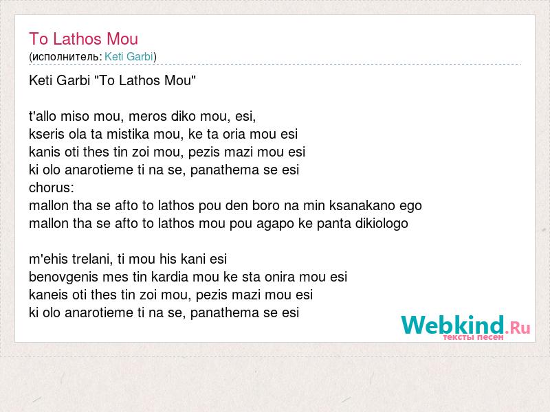 Keti Garbi "To Lathos Mou" t'allo miso mou, meros diko mou, esi, kseris ola ta mistika mou, ke ta oria mou esi kanis oti thes tin zoi mou, pezis mazi mou esi ki olo anarotieme ti na se, panathema se esi chorus: mallon tha se afto to lathos pou den boro na min ksanakano ego mallon tha se afto to lathos mou pou agapo ke panta dikiologo m'ehis trelani, ti mou his kani esi benovgenis mes tin kardia mou ke sta onira mou esi kaneis oti thes tin zoi mou, pezis mazi mou esi ki olo anarotieme ti na se, panathema se esi