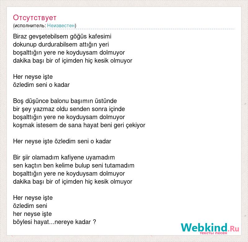 Biraz gevşetebilsem göğüs kafesimi dokunup durdurabilsem attığın yeri boşalttığın yere ne koyduysam dolmuyor dakika başı bir of içimden hiç kesik olmuyor Her neyse işte özledim seni o kadar Boş düşünce balonu başımın üstünde bir şey yazmaz oldu senden sonra içinde boşalttığın yere ne koyduysam dolmuyor koşmak istesem de sana hayat beni geri çekiyor Her neyse işte özledim seni o kadar Bir şiir olamadım kafiyene uyamadım sen kaçtın ben kelime bulup seni tutamadım boşalttığın yere ne koyduysam dolmuyor dakika başı bir of içimden hiç kesik olmuyor Her neyse işte özledim seni her neyse işte böylesi hayat...nereye kadar ?