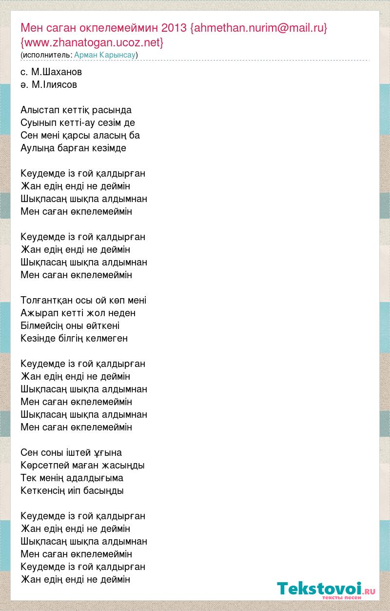 с. М.Шаханов ә. М.Ілиясов Алыстап кеттіқ расында Суынып кетті-ау сезім де Сен мені қарсы аласың ба Аулыңа барған кезімде Кеудемде із ғой қалдырған Жан едің енді не деймін Шықпасаң шықпа алдымнан Мен саған өкпелемеймін Кеудемде із ғой қалдырған Жан едің енді не деймін Шықпасаң шықпа алдымнан Мен саған өкпелемеймін Толғантқан осы ой көп мені Ажырап кетті жол неден Білмейсің оны өйткені Кезінде білгің келмеген Кеудемде із ғой қалдырған Жан едің енді не деймін Шықпасаң шықпа алдымнан Мен саған өкпелемеймін Шықпасаң шықпа алдымнан Мен саған өкпелемеймін Сен соны іштей ұғына Көрсетпей маған жасыңды Тек менің адалдығыма Кеткенсің иіп басыңды Кеудемде із ғой қалдырған Жан едің енді не деймін Шықпасаң шықпа алдымнан Мен саған өкпелемеймін Кеудемде із ғой қалдырған Жан едің енді не деймін