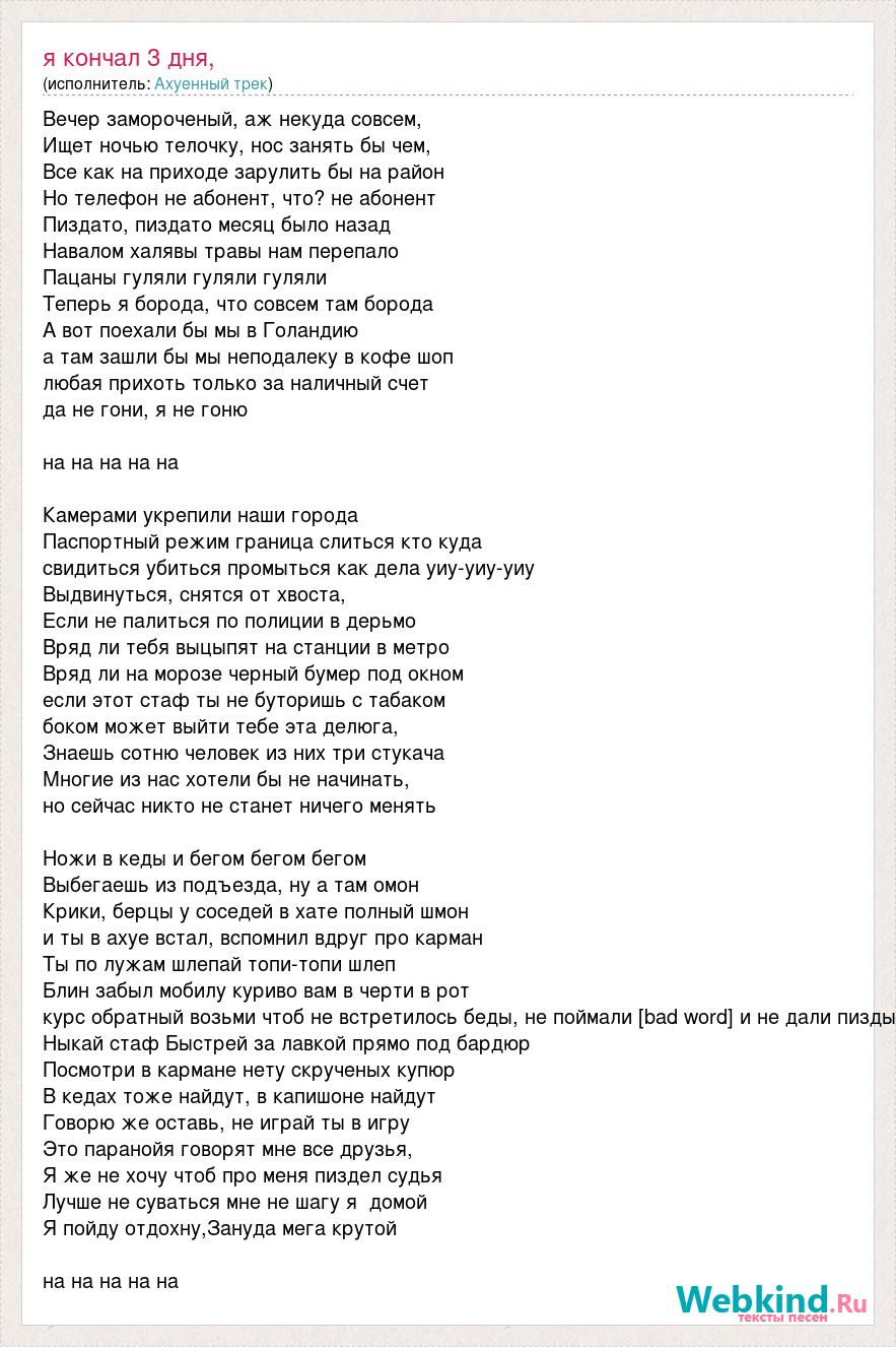 Вечер замороченый, аж некуда совсем, Ищет ночью телочку, нос занять бы чем, Все как на приходе зарулить бы на район Но телефон не абонент, что? не абонент Пиздато, пиздато месяц было назад Навалом халявы травы нам перепало Пацаны гуляли гуляли гуляли Теперь я борода, что совсем там борода А вот поехали бы мы в Голандию а там зашли бы мы неподалеку в кофе шоп любая прихоть только за наличный счет да не гони, я не гоню на на на на на Камерами укрепили наши города Паспортный режим граница слиться кто куда свидиться убиться промыться как дела уиу-уиу-уиу Выдвинуться, снятся от хвоста, Если не палиться по полиции в дерьмо Вряд ли тебя выцыпят на станции в метро Вряд ли на морозе черный бумер под окном если этот стаф ты не буторишь с табаком боком может выйти тебе эта делюга, Знаешь сотню человек из них три стукача Многие из нас хотели бы не начинать, но сейчас никто не станет ничего менять Ножи в кеды и бегом бегом бегом Выбегаешь из подъезда, ну а там омон Крики, берцы у соседей в хате полный шмон и ты в ахуе встал, вспомнил вдруг про карман Ты по лужам шлепай топи-топи шлеп Блин забыл мобилу куриво вам в черти в рот курс обратный возьми чтоб не встретилось беды, не поймали [bad word] и не дали пизды Ныкай стаф Быстрей за лавкой прямо под бардюр Посмотри в кармане нету скрученых купюр В кедах тоже найдут, в капишоне найдут Говорю же оставь, не играй ты в игру Это паранойя говорят мне все друзья, Я же не хочу чтоб про меня пиздел судья Лучше не суваться мне не шагу я домой Я пойду отдохну,Зануда мега крутой на на на на на