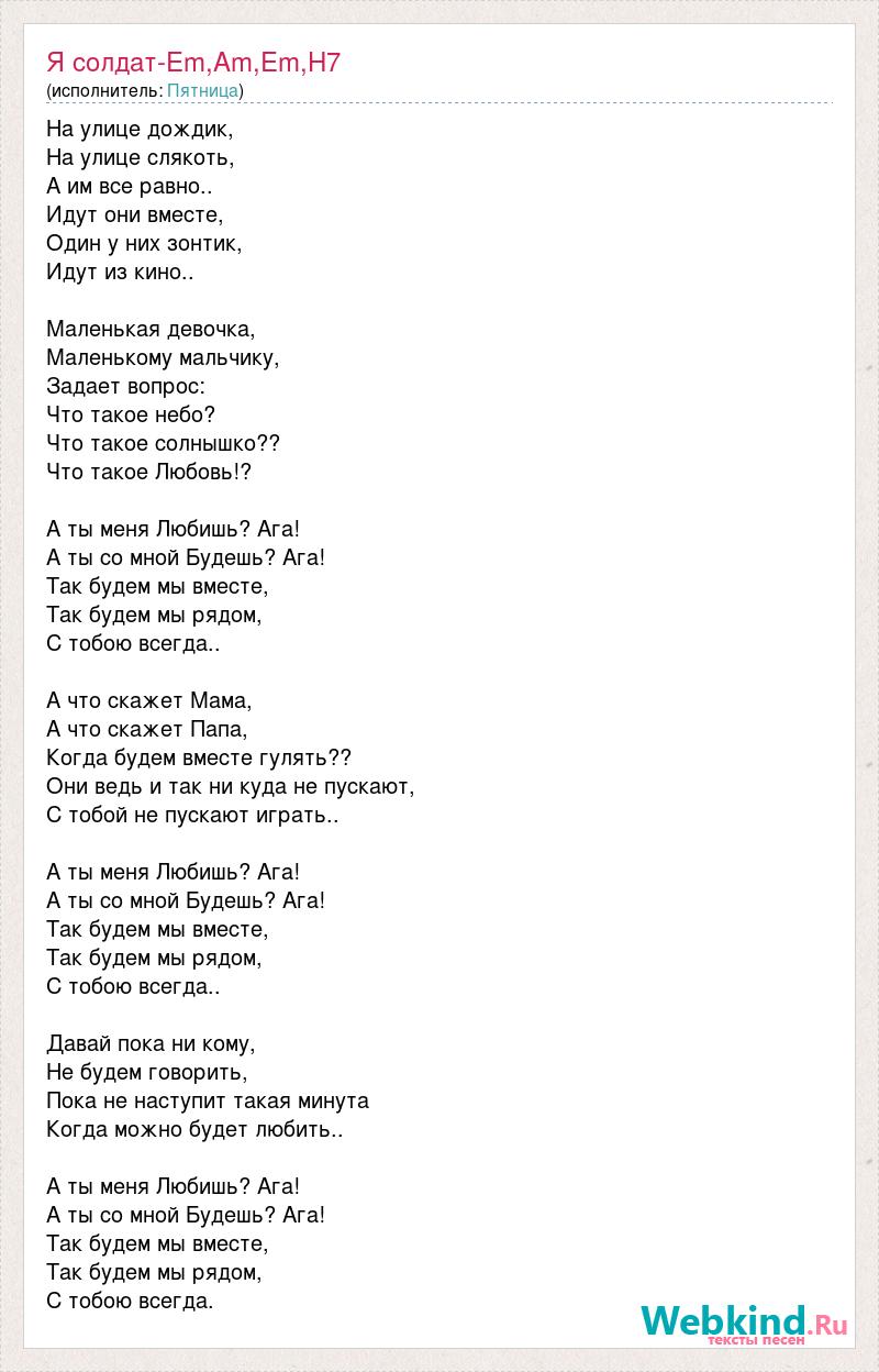 На улице дождик, На улице слякоть, А им все равно.. Идут они вместе, Один у них зонтик, Идут из кино.. Маленькая девочка, Маленькому мальчику, Задает вопрос: Что такое небо? Что такое солнышко?? Что такое Любовь!? А ты меня Любишь? Ага! А ты со мной Будешь? Ага! Так будем мы вместе, Так будем мы рядом, С тобою всегда.. А что скажет Мама, А что скажет Папа, Когда будем вместе гулять?? Они ведь и так ни куда не пускают, С тобой не пускают играть.. А ты меня Любишь? Ага! А ты со мной Будешь? Ага! Так будем мы вместе, Так будем мы рядом, С тобою всегда.. Давай пока ни кому, Не будем говорить, Пока не наступит такая минута Когда можно будет любить.. А ты меня Любишь? Ага! А ты со мной Будешь? Ага! Так будем мы вместе, Так будем мы рядом, С тобою всегда.