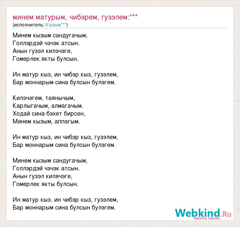 Минем кызым сандугачым, Голлэрдэй чэчэк атсын. Анын гузэл килэчэге, Гомерлек якты булсын. Ин матур кыз, ин чибэр кыз, гузэлем, Бар моннарым сина булсын булэгем. Килэчэгем, таянычым, Карлыгачым, алмагачым. Ходай сина бэхет бирсен, Минем кызым, аппагым. Ин матур кыз, ин чибэр кыз, гузэлем, Бар моннарым сина булсын булэгем. Минем кызым сандугачым, Голлэрдэй чэчэк атсын. Анын гузэл килячэге, Гомерлек якты булсын. Ин матур кыз. ин чибэр кыз, гузэлем, Бар моннарым сина булсын булэгем.