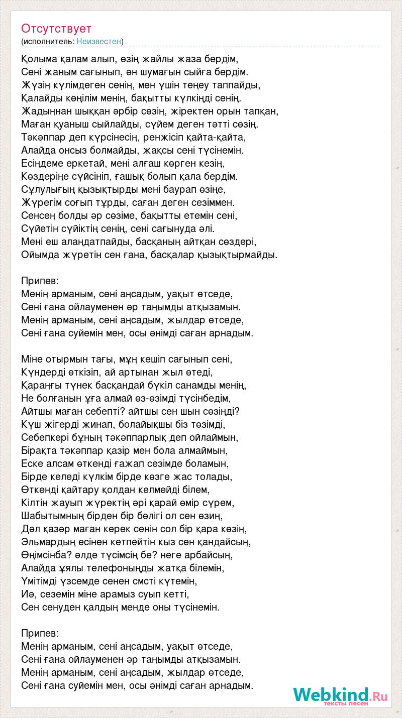 Қолыма қалам алып, өзің жайлы жаза бердім, Сені жаным сағынып, ән шумағын сыйға бердім. Жүзің күлімдеген сенің, мен үшін теңеу таппайды, Қалайды көңілім менің, бақытты күлкіңді сенің. Жадыңнан шыққан әрбір сөзің, жіректен орын тапқан, Маған қуаныш сыйлайды, сүйем деген тәтті сөзің. Тәкәппар деп күрсінесің, ренжісіп қайта-қайта, Алайда онсыз болмайды, жақсы сені түсінемін. Есіңдеме еркетай, мені алғаш көрген кезің, Көздеріңе сүйсініп, ғашық болып қала бердім. Сұлулығың қызықтырды мені баурап өзіңе, Жүрегім соғып тұрды, саған деген сезіммен. Сенсең болды әр сөзіме, бақытты етемін сені, Сүйетін сүйіктің сенің, сені сағынуда әлі. Мені еш алаңдатпайды, басқаның айтқан сөздері, Ойымда жүретін сен ғана, басқалар қызықтырмайды. Припев: Менің арманым, сені аңсадым, уақыт өтседе, Сені ғана ойлауменен әр таңымды атқызамын. Менің арманым, сені аңсадым, жылдар өтседе, Сені ғана суйемін мен, осы әнімді саған арнадым. Міне отырмын тағы, мұң кешіп сағынып сені, Күндерді өткізіп, ай артынан жыл өтеді, Қараңғы түнек басқандай бүкіл санамды менің, Не болғанын ұға алмай өз-өзімді түсінбедім, Айтшы маған себепті? айтшы сен шын сөзіңді? Күш жігерді жинап, болайықшы біз төзімді, Себепкері бұның тәкәппарлық деп ойлаймын, Бірақта тәкәппар қазір мен бола алмаймын, Еске алсам өткенді ғажап сезімде боламын, Бірде келеді күлкім бірде көзге жас толады, Өткенді қайтару қолдан келмейді білем, Кілтін жауып жүректің әрі қарай өмір сүрем, Шабытымның бірден бір бөлігі ол сен өзиң, Дәл қазәр маған керек сенін сол бір қара көзің, Эльмардың есінен кетпейтін кыз сен қандайсың, Өңімсінба? әлде түсімсің бе? неге арбайсың, Алайда ұялы телефоныңды жатқа білемін, Үмітімді үзсемде сенен смсті күтемін, Иә, сеземін міне арамыз суып кетті, Сен сенуден қалдың менде оны түсінемін. Припев: Менің арманым, сені аңсадым, уақыт өтседе, Сені ғана ойлауменен әр таңымды атқызамын. Менің арманым, сені аңсадым, жылдар өтседе, Сені ғана суйемін мен, осы әнімді саған арнадым.