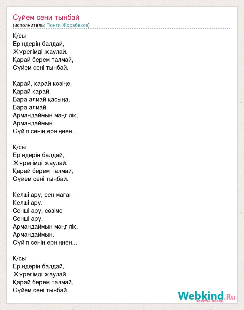 Қ/сы Еріндерің балдай, Жүрегімді жаулай. Қарай берем талмай, Сүйем сені тынбай. Қарай, қарай көзіңе, Қарай қарай. Бара алмай қасыңа, Бара алмай. Армандаймын мәңгілік, Армандаймын. Сүйіп сенің ерніңнен... Қ/сы Еріндерің балдай, Жүрегімді жаулай. Қарай берем талмай, Сүйем сені тынбай. Келші ару, сен маған Келші ару. Сенші ару, сөзіме Сенші ару. Армандаймын мәңгілік, Армандаймын. Сүйіп сенің ерніңнен... Қ/сы Еріндерің балдай, Жүрегімді жаулай. Қарай берем талмай, Сүйем сені тынбай.