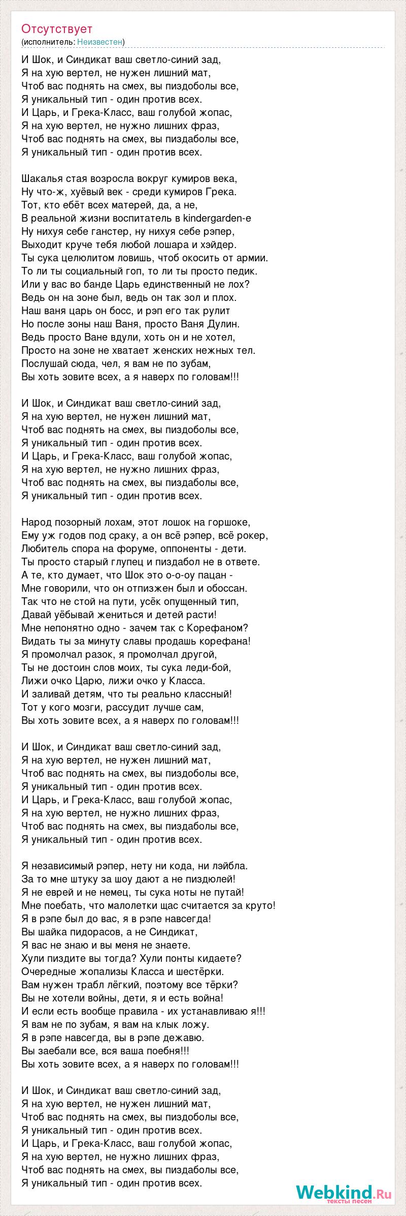 И Шок, и Синдикат ваш светло-синий зад, Я на хую вертел, не нужен лишний мат, Чтоб вас поднять на смех, вы пиздоболы все, Я уникальный тип - один против всех. И Царь, и Грека-Класс, ваш голубой жопас, Я на хую вертел, не нужно лишних фраз, Чтоб вас поднять на смех, вы пиздаболы все, Я уникальный тип - один против всех. Шакалья стая возросла вокруг кумиров века, Ну что-ж, хуёвый век - среди кумиров Грека. Тот, кто ебёт всех матерей, да, а не, В реальной жизни воспитатель в kindergarden-е Ну нихуя себе ганстер, ну нихуя себе рэпер, Выходит круче тебя любой лошара и хэйдер. Ты сука целюлитом ловишь, чтоб окосить от армии. То ли ты социальный гоп, то ли ты просто педик. Или у вас во банде Царь единственный не лох? Ведь он на зоне был, ведь он так зол и плох. Наш ваня царь он босс, и рэп его так рулит Но после зоны наш Ваня, просто Ваня Дулин. Ведь просто Ване вдули, хоть он и не хотел, Просто на зоне не хватает женских нежных тел. Послушай сюда, чел, я вам не по зубам, Вы хоть зовите всех, а я наверх по головам!!! И Шок, и Синдикат ваш светло-синий зад, Я на хую вертел, не нужен лишний мат, Чтоб вас поднять на смех, вы пиздоболы все, Я уникальный тип - один против всех. И Царь, и Грека-Класс, ваш голубой жопас, Я на хую вертел, не нужно лишних фраз, Чтоб вас поднять на смех, вы пиздаболы все, Я уникальный тип - один против всех. Народ позорный лохам, этот лошок на горшоке, Ему уж годов под сраку, а он всё рэпер, всё рокер, Любитель спора на форуме, оппоненты - дети. Ты просто старый глупец и пиздабол не в ответе. А те, кто думает, что Шок это о-о-оу пацан - Мне говорили, что он отпизжен был и обоссан. Так что не стой на пути, усёк опущенный тип, Давай уёбывай жениться и детей расти! Мне непонятно одно - зачем так с Корефаном? Видать ты за минуту славы продашь корефана! Я промолчал разок, я промолчал другой, Ты не достоин слов моих, ты сука леди-бой, Лижи очко Царю, лижи очко у Класса. И заливай детям, что ты реально классный! Тот у кого мозги, рассудит лучше сам, Вы хоть зовите всех, а я наверх по головам!!! И Шок, и Синдикат ваш светло-синий зад, Я на хую вертел, не нужен лишний мат, Чтоб вас поднять на смех, вы пиздоболы все, Я уникальный тип - один против всех. И Царь, и Грека-Класс, ваш голубой жопас, Я на хую вертел, не нужно лишних фраз, Чтоб вас поднять на смех, вы пиздаболы все, Я уникальный тип - один против всех. Я независимый рэпер, нету ни кода, ни лэйбла. За то мне штуку за шоу дают а не пиздюлей! Я не еврей и не немец, ты сука ноты не путай! Мне поебать, что малолетки щас считается за круто! Я в рэпе был до вас, я в рэпе навсегда! Вы шайка пидорасов, а не Синдикат, Я вас не знаю и вы меня не знаете. Хули пиздите вы тогда? Хули понты кидаете? Очередные жопализы Класса и шестёрки. Вам нужен трабл лёгкий, поэтому все тёрки? Вы не хотели войны, дети, я и есть война! И если есть вообще правила - их устанавливаю я!!! Я вам не по зубам, я вам на клык ложу. Я в рэпе навсегда, вы в рэпе дежавю. Вы заебали все, вся ваша поебня!!! Вы хоть зовите всех, а я наверх по головам!!! И Шок, и Синдикат ваш светло-синий зад, Я на хую вертел, не нужен лишний мат, Чтоб вас поднять на смех, вы пиздоболы все, Я уникальный тип - один против всех. И Царь, и Грека-Класс, ваш голубой жопас, Я на хую вертел, не нужно лишних фраз, Чтоб вас поднять на смех, вы пиздаболы все, Я уникальный тип - один против всех.