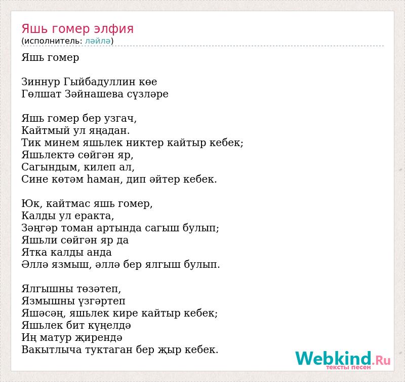 Яшь гомер Зиннур Гыйбадуллин көе Гөлшат Зәйнашева сүзләре Яшь гомер бер узгач, Кайтмый ул яңадан. Тик минем яшьлек никтер кайтыр кебек; Яшьлектә сөйгән яр, Сагындым, килеп ал, Сине көтәм һаман, дип әйтер кебек. Юк, кайтмас яшь гомер, Калды ул еракта, Зәңгәр томан артында сагыш булып; Яшьли сөйгән яр да Ятка калды анда Әллә язмыш, әллә бер ялгыш булып. Ялгышны төзәтеп, Язмышны үзгәртеп Яшәсәң, яшьлек кире кайтыр кебек; Яшьлек бит күңелдә Иң матур җирендә Вакытлыча туктаган бер җыр кебек.