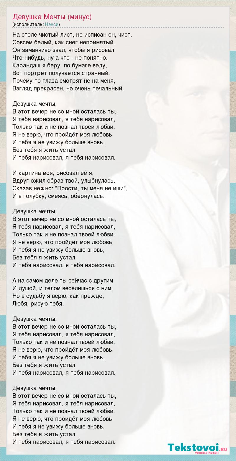 Hа столе чистый лист, не исписан он, чист, Совсем белый, как снег непримятый. Он заманчиво звал, чтобы я рисовал Что-нибудь, ну а что - не понятно. Карандаш я беру, по бумаге веду, Вот портрет получается странный. Почему-то глаза смотрят не на меня, Взгляд прекрасен, но очень печальный. Девушка мечты, В этот вечер не со мной осталась ты, Я тебя нарисовал, я тебя нарисовал, Только так и не познал твоей любви. Я не верю, что пройдёт моя любовь И тебя я не увижу больше вновь, Без тебя я жить устал И тебя нарисовал, я тебя нарисовал. И картина моя, рисовал её я, Вдруг ожил образ твой, улыбнулась. Сказав нежно: "Прости, ты меня не ищи", И в голубку, смеясь, обернулась. Девушка мечты, В этот вечер не со мной осталась ты, Я тебя нарисовал, я тебя нарисовал, Только так и не познал твоей любви. Я не верю, что пройдёт моя любовь И тебя я не увижу больше вновь, Без тебя я жить устал И тебя нарисовал, я тебя нарисовал. А на самом деле ты сейчас с другим И душой, и телом веселишься с ним, Hо в судьбу я верю, как прежде, Любя, рисую тебя. Девушка мечты, В этот вечер не со мной осталась ты, Я тебя нарисовал, я тебя нарисовал, Только так и не познал твоей любви. Я не верю, что пройдёт моя любовь И тебя я не увижу больше вновь, Без тебя я жить устал И тебя нарисовал, я тебя нарисовал. Девушка мечты, В этот вечер не со мной осталась ты, Я тебя нарисовал, я тебя нарисовал, Только так и не познал твоей любви. Я не верю, что пройдёт моя любовь И тебя я не увижу больше вновь, Без тебя я жить устал И тебя нарисовал, я тебя нарисовал.