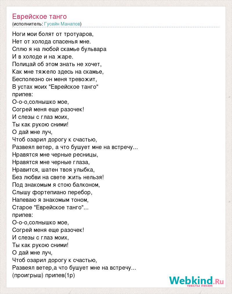 Ноги мои болят от тротуаров, Нет от холода спасенья мне. Сплю я на любой скамье бульвара И в холоде и на жаре. Полицай об этом знать не хочет, Как мне тяжело здесь на скамье, Бесполезно он меня тревожит, В устах моих "Еврейское танго" припев: О-о-о,солнышко мое, Согрей меня еще разочек! И слезы с глаз моих, Ты как рукою сними! О дай мне луч, Чтоб озарил дорогу к счастью, Развеял ветер, а что бушует мне на встречу... Нравятся мне черные ресницы, Нравятся мне черные глаза, Нравится, шатен твоя улыбка, Без любви на свете жить нельзя! Под знакомым я стою балконом, Слышу фортепиано перебор, Напеваю я знакомым тоном, Старое "Еврейское танго"... припев: О-о-о,солнышко мое, Согрей меня еще разочек! И слезы с глаз моих, Ты как рукою сними! О дай мне луч, Чтоб озарил дорогу к счастью, Развеял ветер,а что бушует мне на встречу... (проигрыш) припев(1р)