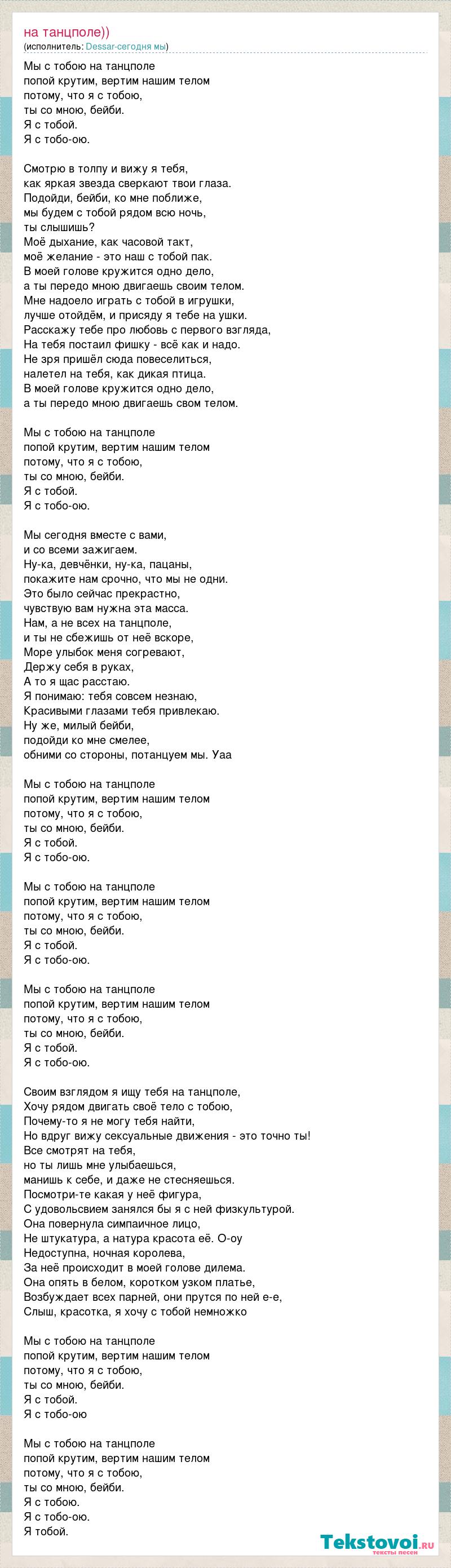 Мы с тобою на танцполе попой крутим, вертим нашим телом потому, что я с тобою, ты со мною, бейби. Я с тобой. Я с тобо-ою. Смотрю в толпу и вижу я тебя, как яркая звезда сверкают твои глаза. Подойди, бейби, ко мне поближе, мы будем с тобой рядом всю ночь, ты слышишь? Моё дыхание, как часовой такт, моё желание - это наш с тобой пак. В моей голове кружится одно дело, а ты передо мною двигаешь своим телом. Мне надоело играть с тобой в игрушки, лучше отойдём, и присяду я тебе на ушки. Расскажу тебе про любовь с первого взгляда, На тебя постаил фишку - всё как и надо. Не зря пришёл сюда повеселиться, налетел на тебя, как дикая птица. В моей голове кружится одно дело, а ты передо мною двигаешь свом телом. Мы с тобою на танцполе попой крутим, вертим нашим телом потому, что я с тобою, ты со мною, бейби. Я с тобой. Я с тобо-ою. Мы сегодня вместе с вами, и со всеми зажигаем. Ну-ка, девчёнки, ну-ка, пацаны, покажите нам срочно, что мы не одни. Это было сейчас прекрастно, чувствую вам нужна эта масса. Нам, а не всех на танцполе, и ты не сбежишь от неё вскоре, Море улыбок меня согревают, Держу себя в руках, А то я щас расстаю. Я понимаю: тебя совсем незнаю, Красивыми глазами тебя привлекаю. Ну же, милый бейби, подойди ко мне смелее, обними со стороны, потанцуем мы. Уаа Мы с тобою на танцполе попой крутим, вертим нашим телом потому, что я с тобою, ты со мною, бейби. Я с тобой. Я с тобо-ою. Мы с тобою на танцполе попой крутим, вертим нашим телом потому, что я с тобою, ты со мною, бейби. Я с тобой. Я с тобо-ою. Мы с тобою на танцполе попой крутим, вертим нашим телом потому, что я с тобою, ты со мною, бейби. Я с тобой. Я с тобо-ою. Своим взглядом я ищу тебя на танцполе, Хочу рядом двигать своё тело с тобою, Почему-то я не могу тебя найти, Но вдруг вижу сексуальные движения - это точно ты! Все смотрят на тебя, но ты лишь мне улыбаешься, манишь к себе, и даже не стесняешься. Посмотри-те какая у неё фигура, С удовольсвием занялся бы я с ней физкультурой. Она повернула симпаичное лицо, Не штукатура, а натура красота её. О-оу Недоступна, ночная королева, За неё происходит в моей голове дилема. Она опять в белом, коротком узком платье, Возбуждает всех парней, они прутся по ней е-е, Слыш, красотка, я хочу с тобой немножко Мы с тобою на танцполе попой крутим, вертим нашим телом потому, что я с тобою, ты со мною, бейби. Я с тобой. Я с тобо-ою Мы с тобою на танцполе попой крутим, вертим нашим телом потому, что я с тобою, ты со мною, бейби. Я с тобою. Я с тобо-ою. Я тобой.