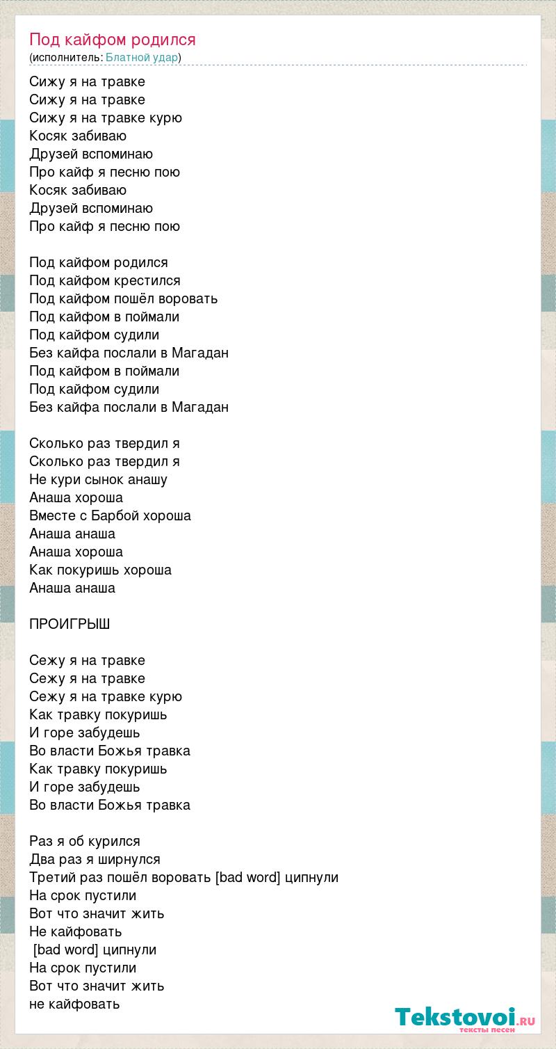 Сижу я на травке Сижу я на травке Сижу я на травке курю Косяк забиваю Друзей вспоминаю Про кайф я песню пою Косяк забиваю Друзей вспоминаю Про кайф я песню пою Под кайфом родился Под кайфом крестился Под кайфом пошёл воровать Под кайфом в поймали Под кайфом судили Без кайфа послали в Магадан Под кайфом в поймали Под кайфом судили Без кайфа послали в Магадан Сколько раз твердил я Сколько раз твердил я Не кури сынок анашу Анаша хороша Вместе с Барбой хороша Анаша анаша Анаша хороша Как покуришь хороша Анаша анаша ПРОИГРЫШ Сежу я на травке Сежу я на травке Сежу я на травке курю Как травку покуришь И горе забудешь Во власти Божья травка Как травку покуришь И горе забудешь Во власти Божья травка Раз я об курился Два раз я ширнулся Третий раз пошёл воровать [bad word] ципнули На срок пустили Вот что значит жить Не кайфовать [bad word] ципнули На срок пустили Вот что значит жить не кайфовать