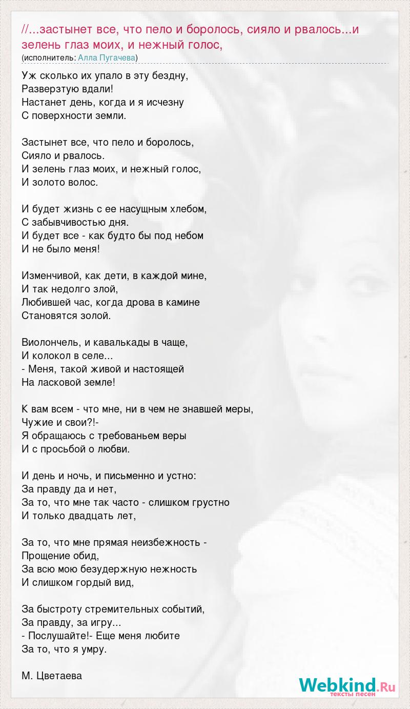 Главная→Исполнители→Алла Пугачёва→//...застынет все, что пело и боролось, сияло и рвалось...и зелень глаз моих,
