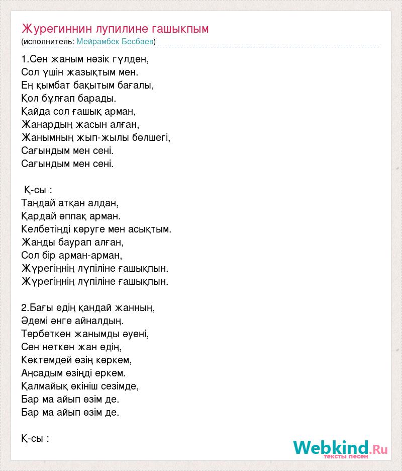 1.Сен жаным нәзік гүлден, Сол үшін жазықтым мен. Ең қымбат бақытым бағалы, Қол бұлғап барады. Қайда сол ғашық арман, Жанардың жасын алған, Жанымның жып-жылы бөлшегі, Сағындым мен сені. Сағындым мен сені. Қ-сы : Таңдай атқан алдан, Қардай әппақ арман. Келбетіңді көруге мен асықтым. Жанды баурап алған, Сол бір арман-арман, Жүрегіңнің лүпіліне ғашықпын. Жүрегіңнің лүпіліне ғашықпын. 2.Бағы едің қандай жанның, Әдемі әнге айналдың. Тербеткен жанымды әуені, Сен неткен жан едің, Көктемдей өзің көркем, Аңсадым өзіңді еркем. Қалмайық өкініш сезімде, Бар ма айып өзім де. Бар ма айып өзім де. Қ-сы :