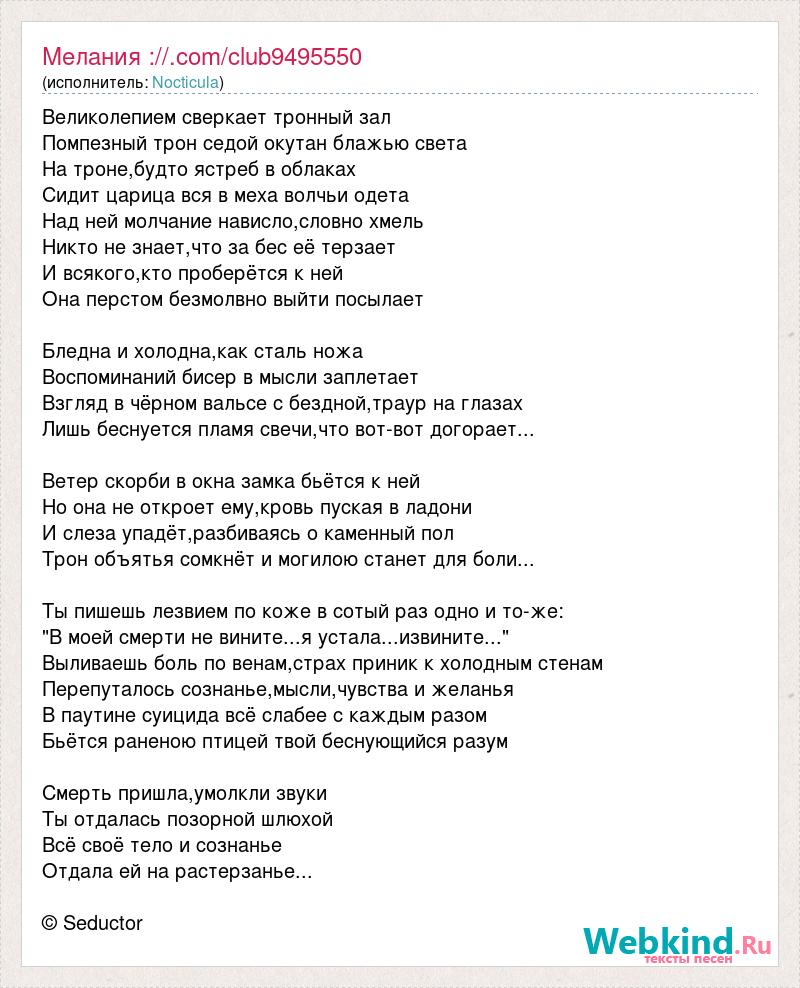 Великолепием сверкает тронный зал Помпезный трон седой окутан блажью света На троне,будто ястреб в облаках Сидит царица вся в меха волчьи одета Над ней молчание нависло,словно хмель Никто не знает,что за бес её терзает И всякого,кто проберётся к ней Она перстом безмолвно выйти посылает Бледна и холодна,как сталь ножа Воспоминаний бисер в мысли заплетает Взгляд в чёрном вальсе с бездной,траур на глазах Лишь беснуется пламя свечи,что вот-вот догорает... Ветер скорби в окна замка бьётся к ней Но она не откроет ему,кровь пуская в ладони И слеза упадёт,разбиваясь о каменный пол Трон объятья сомкнёт и могилою станет для боли... Ты пишешь лезвием по коже в сотый раз одно и то-же: "В моей смерти не вините...я устала...извините..." Выливаешь боль по венам,страх приник к холодным стенам Перепуталось сознанье,мысли,чувства и желанья В паутине суицида всё слабее с каждым разом Бьётся раненою птицей твой беснующийся разум Смерть пришла,умолкли звуки Ты отдалась позорной шлюхой Всё своё тело и сознанье Отдала ей на растерзанье... © Seductor