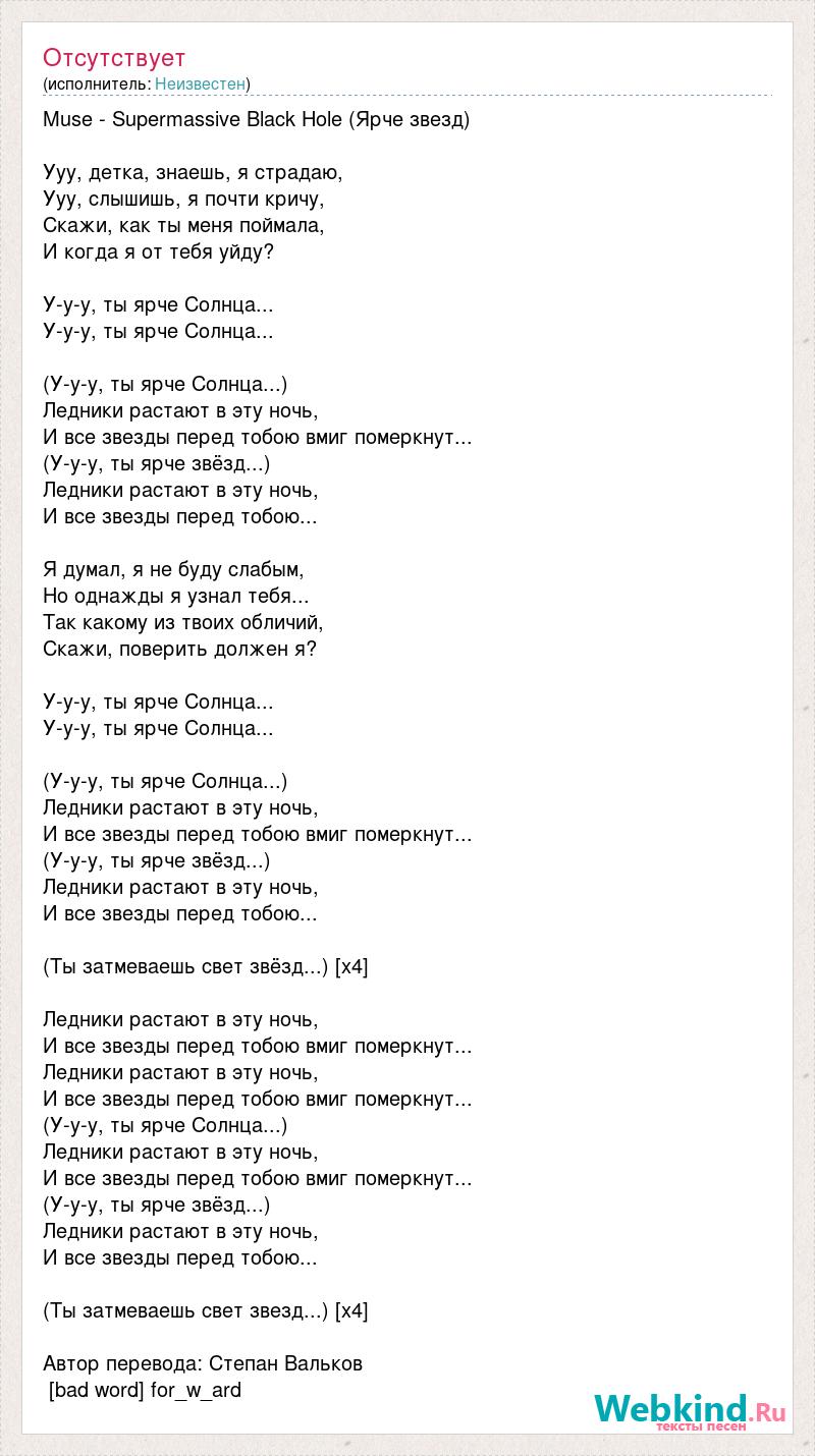 Muse - Supermassive Black Hole (Ярче звезд) Ууу, детка, знаешь, я страдаю, Ууу, слышишь, я почти кричу, Скажи, как ты меня поймала, И когда я от тебя уйду? У-у-у, ты ярче Солнца... У-у-у, ты ярче Солнца... (У-у-у, ты ярче Солнца...) Ледники растают в эту ночь, И все звезды перед тобою вмиг померкнут... (У-у-у, ты ярче звёзд...) Ледники растают в эту ночь, И все звезды перед тобою... Я думал, я не буду слабым, Но однажды я узнал тебя... Так какому из твоих обличий, Скажи, поверить должен я? У-у-у, ты ярче Солнца... У-у-у, ты ярче Солнца... (У-у-у, ты ярче Солнца...) Ледники растают в эту ночь, И все звезды перед тобою вмиг померкнут... (У-у-у, ты ярче звёзд...) Ледники растают в эту ночь, И все звезды перед тобою... (Ты затмеваешь свет звёзд...) [x4] Ледники растают в эту ночь, И все звезды перед тобою вмиг померкнут... Ледники растают в эту ночь, И все звезды перед тобою вмиг померкнут... (У-у-у, ты ярче Солнца...) Ледники растают в эту ночь, И все звезды перед тобою вмиг померкнут... (У-у-у, ты ярче звёзд...) Ледники растают в эту ночь, И все звезды перед тобою... (Ты затмеваешь свет звезд...) [x4] Автор перевода: Степан Вальков [bad word] for_w_ard